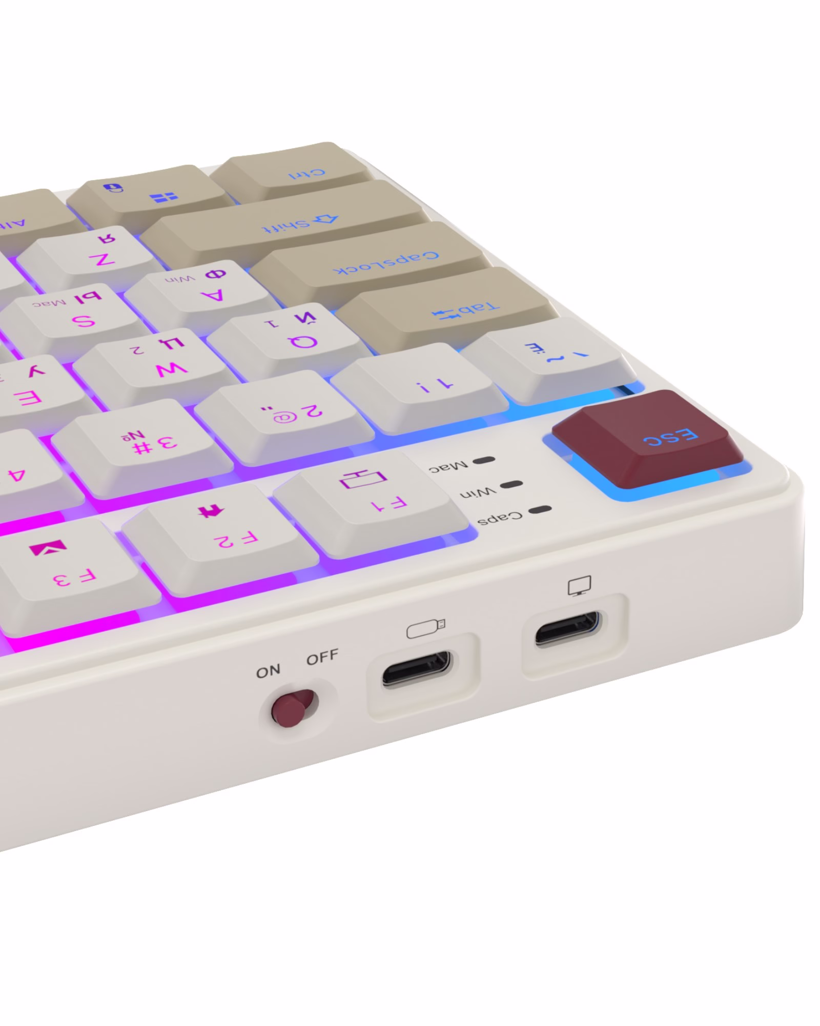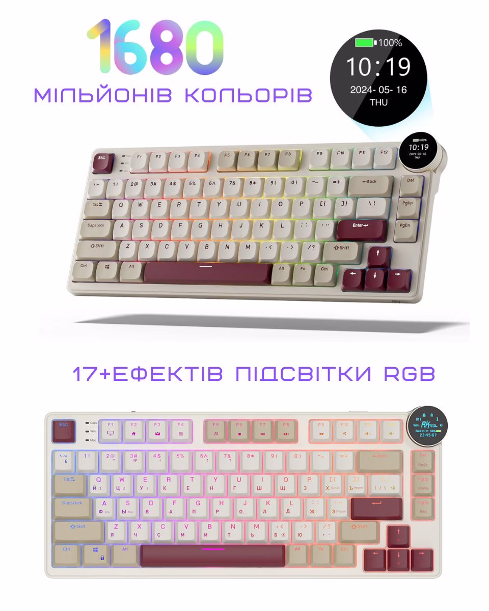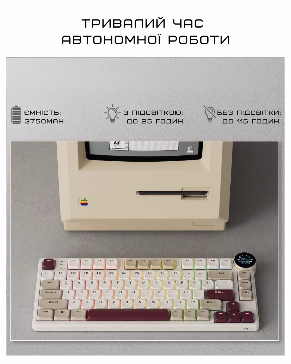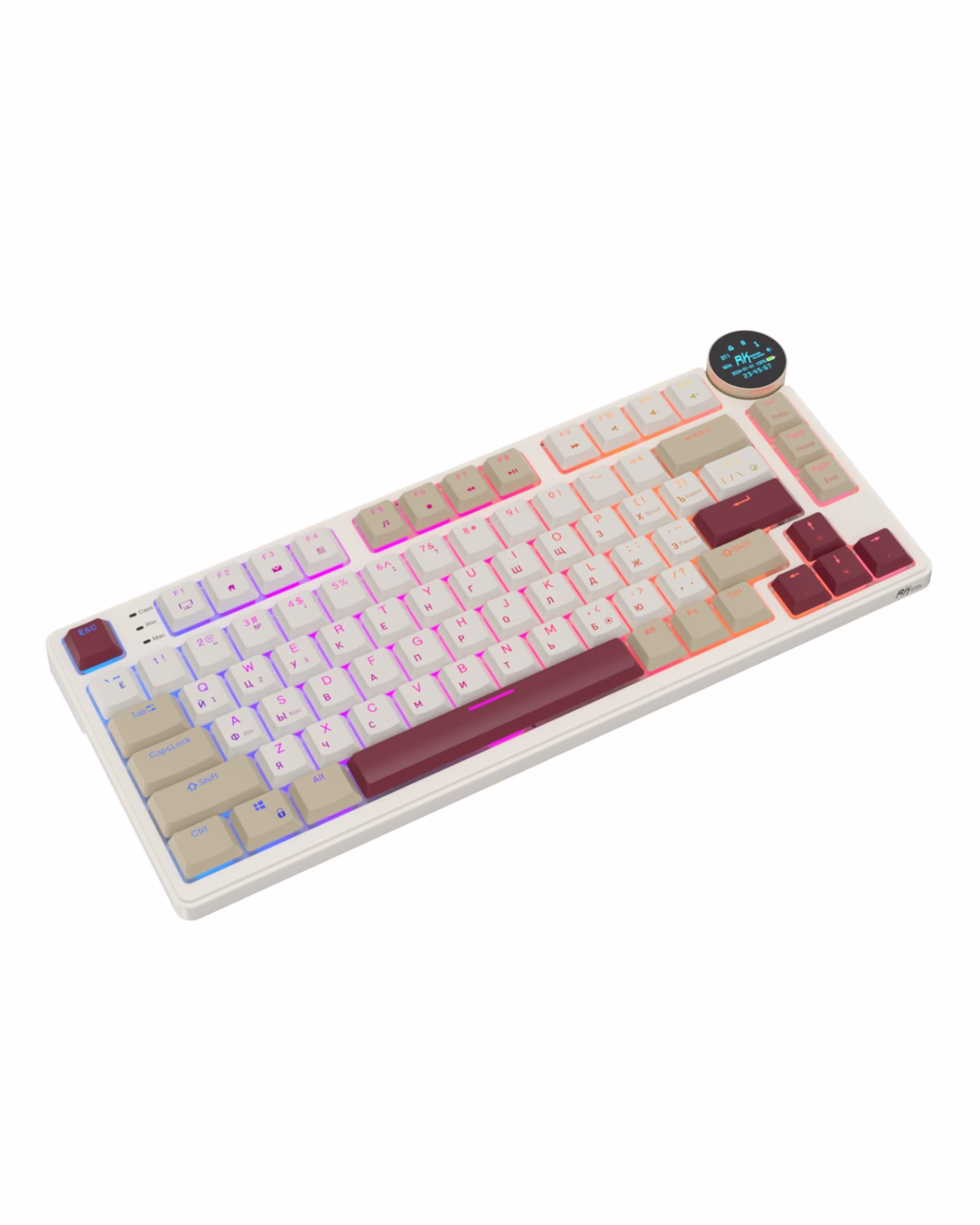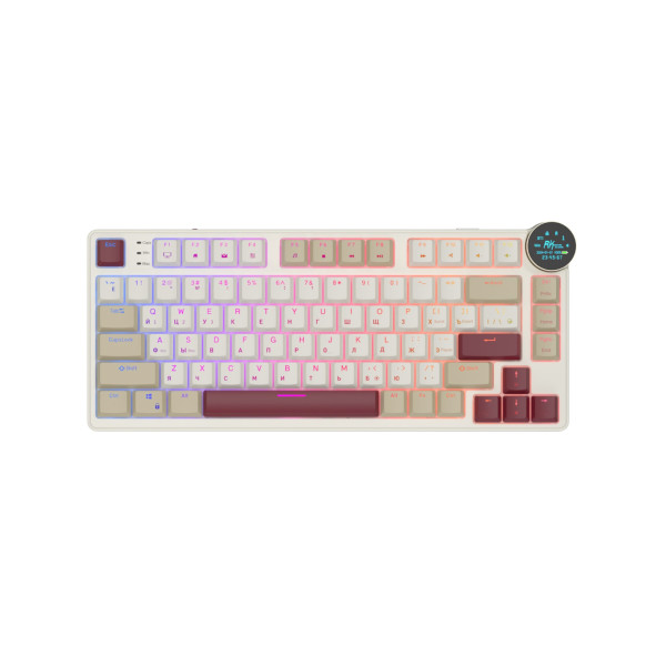- Інтегрований міні‑екран з коліщатком: динамічний дисплей відображає на маленькому екрані власні GIF-файли, дати, режими підключення, розкладки WIN/MAC та стан батареї. Повернувши коліщатко можна відрегулювати гучність, яскравість/швидкість підсвічування та режими/кольори RGB-підсвітки