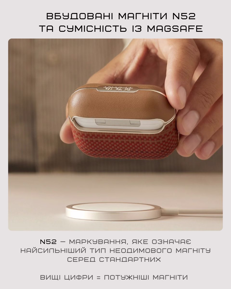 Магніти N52 чітко фіксують кейс на MagSafe, а сам чохол не заважає зарядці. Магніти N52 — це найпотужніші серед стандартних неодимових магнітів. Вони маленькі, але виконують велику роботу — саме завдяки їм усе прилягає точно, зарядка починається одразу, і кейс не зміщується під час заряджання.