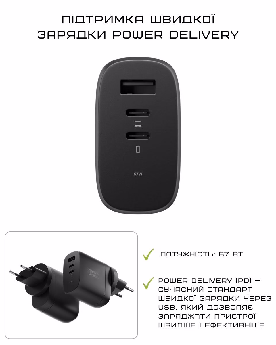 - Більше потужності в меншому корпусі. Завдяки GaN зарядний блок залишається компактним, але забезпечує до 67 Вт — цього вистачає для ноутбуків, планшетів, смартфонів і інших пристроїв.