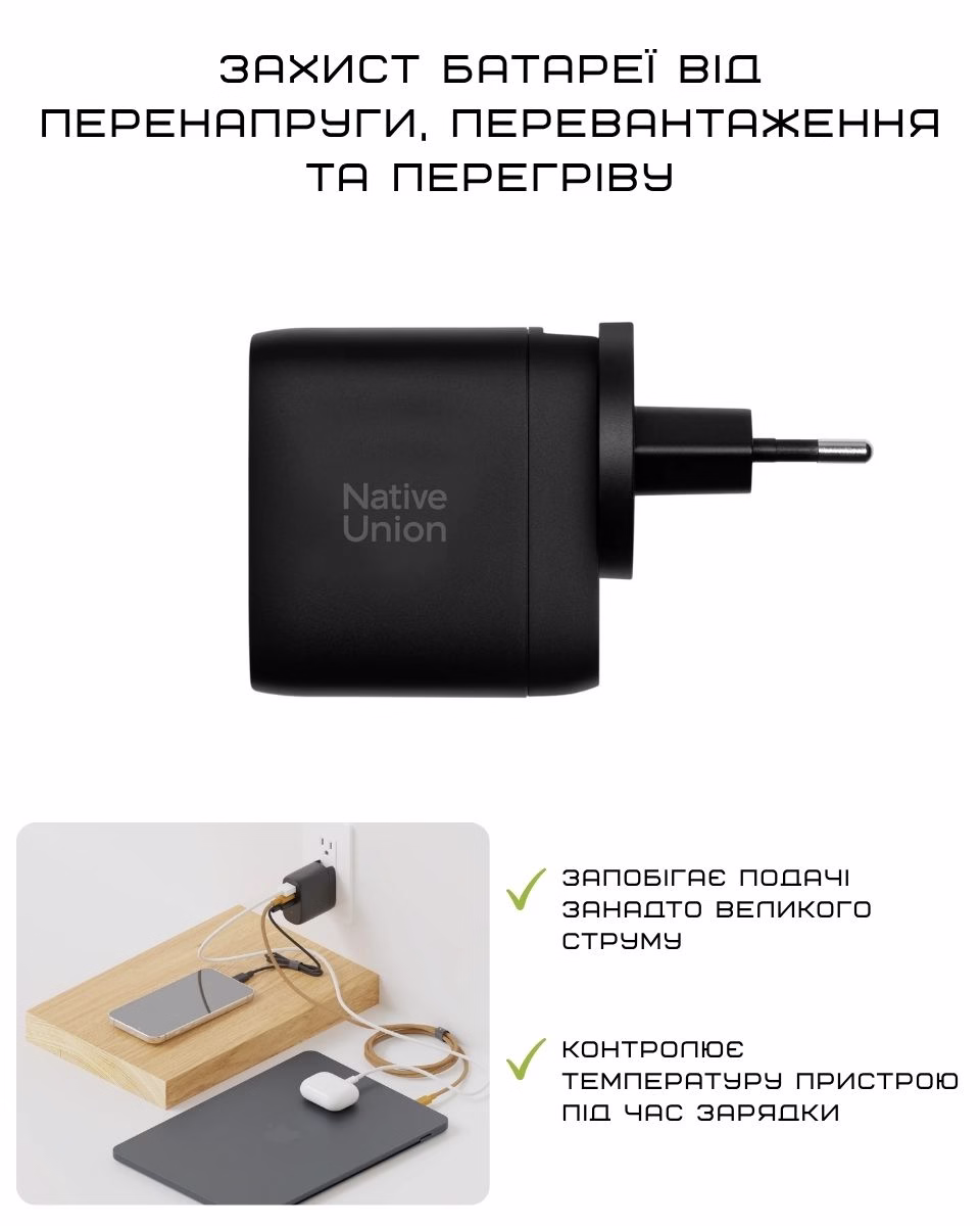 - Менше перегріву. GaN краще проводить струм, тому зарядка працює стабільніше й не нагрівається, навіть під час одночасної зарядки кількох пристроїв.
