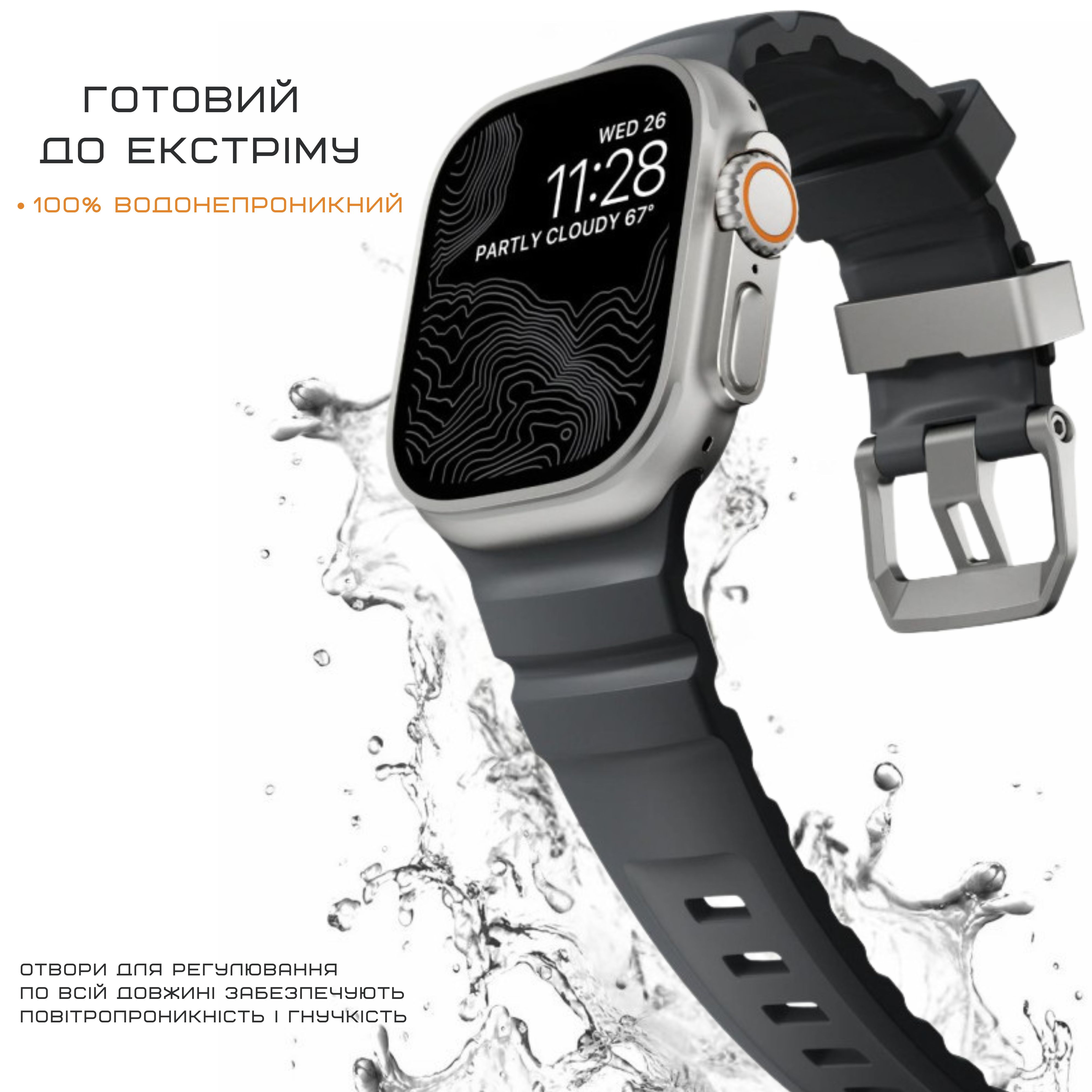 Цей ремінець створений для тих, хто цінує свободу та активний спосіб життя. Виготовлений з надміцного фтореластомеру (FKM) та титанової фурнітури, він витримає будь-які твої випробування – від інтенсивних тренувань до повсякденних справ. Вентиляційні канали забезпечують комфорт навіть у найспекотніші дні.