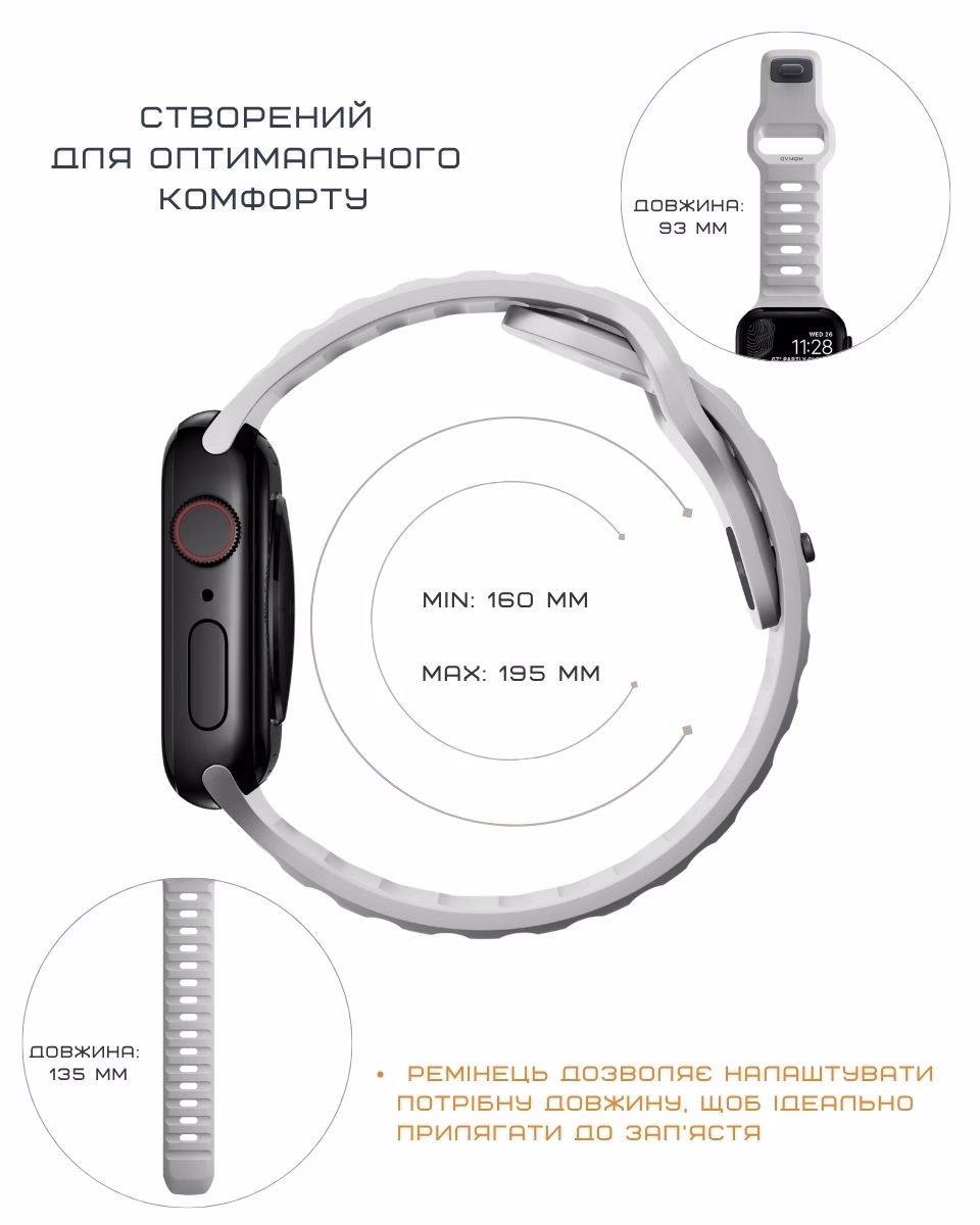 Sport Band повторює контури зап'ястя і адаптується до руху руки, не обмежує амплітуду та зберігає комфорт протягом дня. Гнучкість матеріалу забезпечує природну посадку без відчуття тиску. На руці залишаються приємні відчуття легкості.