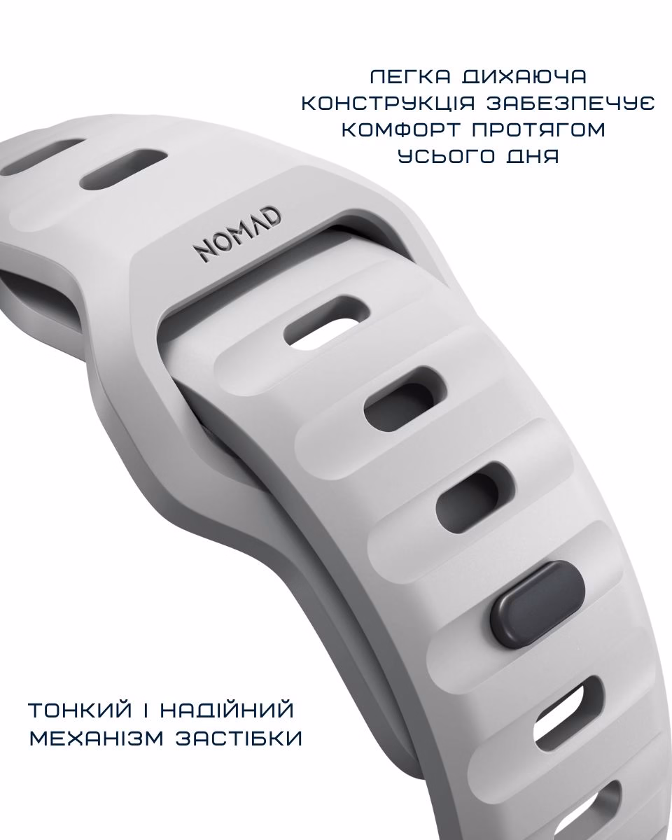 Nomad Sport Band виготовлений із FKM (fluoroelastomer) — сучасного еластомеру, який відзначається стійкістю до навантажень і зберігає свої властивості з часом. FKM — хімічно інертний матеріал: не взаємодіє зі шкірою, не вбирає вологу та підходить для тривалого контакту, зокрема при чутливій шкірі.