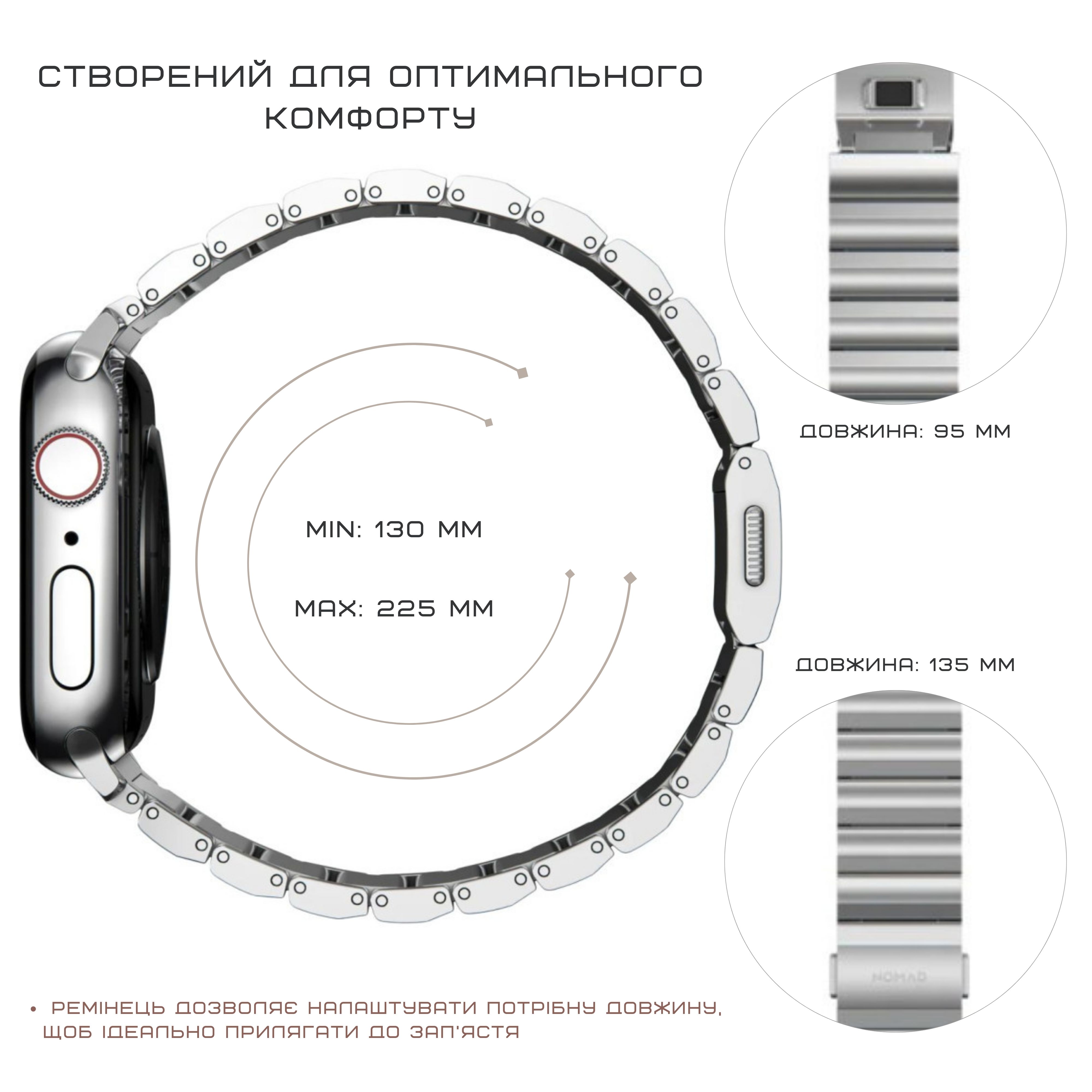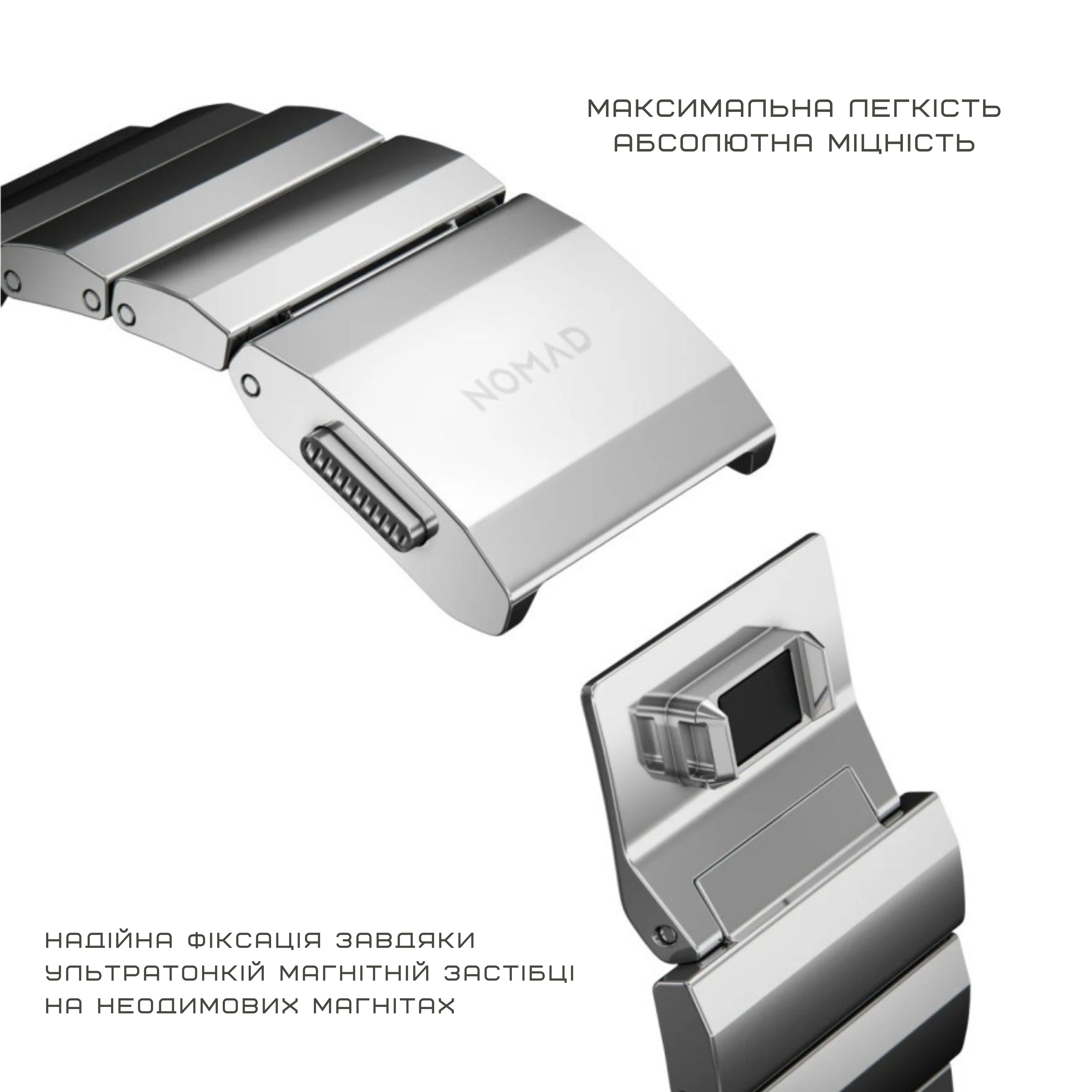 Уяви собі ремінець, який поєднує в собі холодну елегантність металу з теплом твоєї шкіри. Nomad Metal Band – це втілення вишуканості та міцності, представлене в трьох благородних металах: нержавіюча сталь, легкий титан та витончений алюміній.