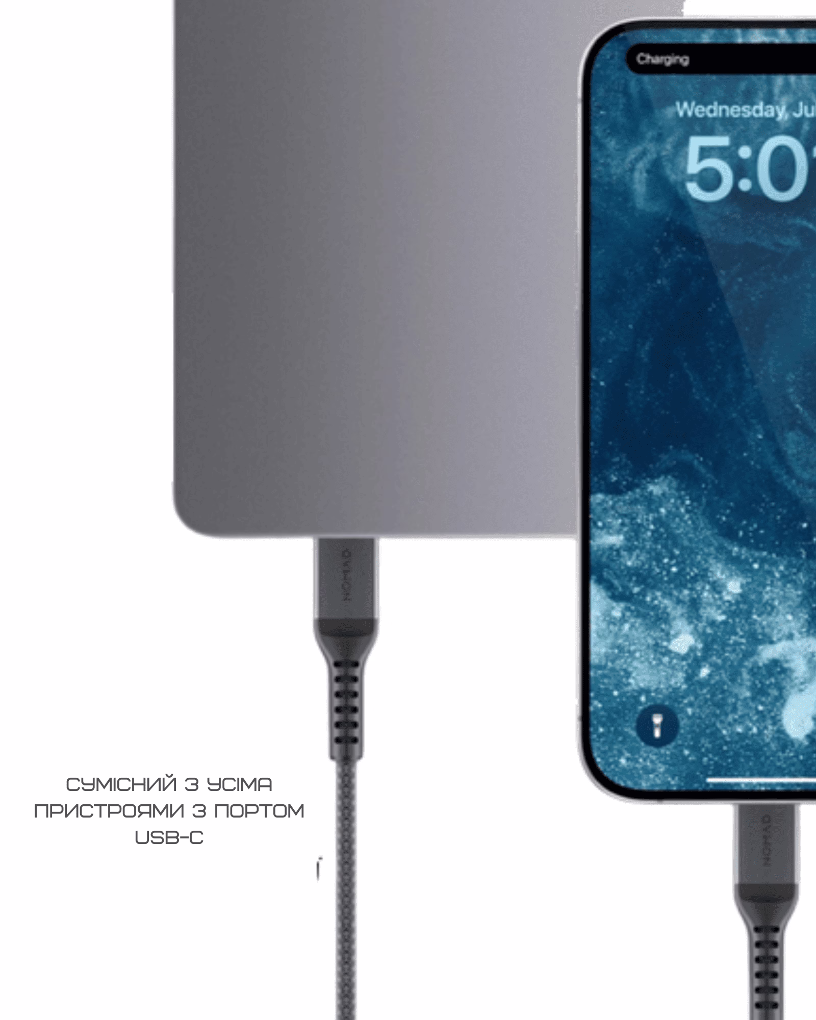 Nomad USB-C Kevlar Cable підтримує зарядку до 100 Вт, що робить його ідеальним для зарядки потужних пристроїв, таких як iPhone, iPad, MacBook, AirPods та інших гаджетів з портами USB-C. Забезпечуючи швидку і безпечну зарядку, він дозволяє швидко відновити енергію Ваших пристроїв, що особливо важливо, коли час на рахунку.