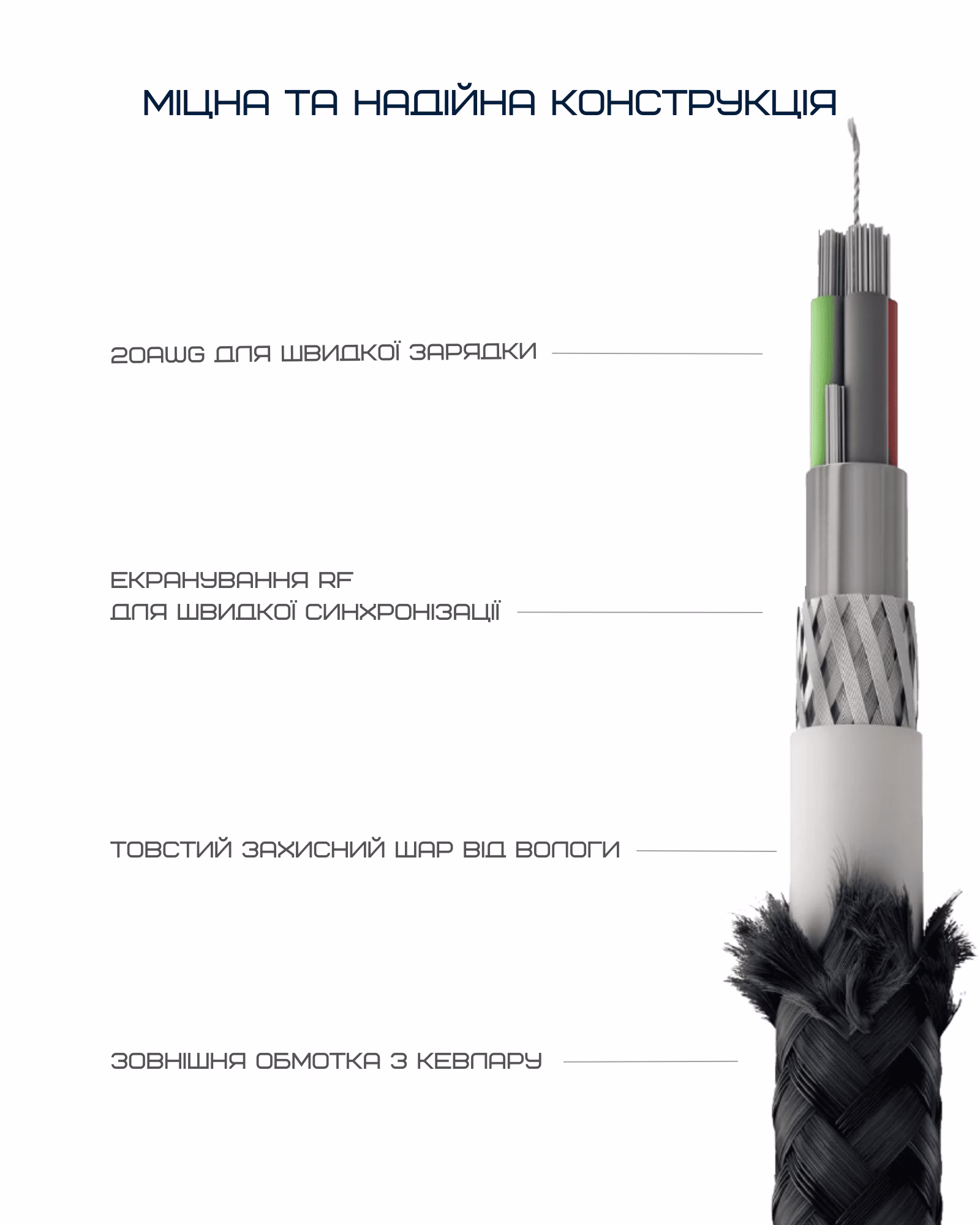 - Надійність: виготовлений із армованого кевларом волокна, цей кабель забезпечує високу міцність і стійкість до пошкоджень, що гарантує тривалу службу навіть за інтенсивного використання.