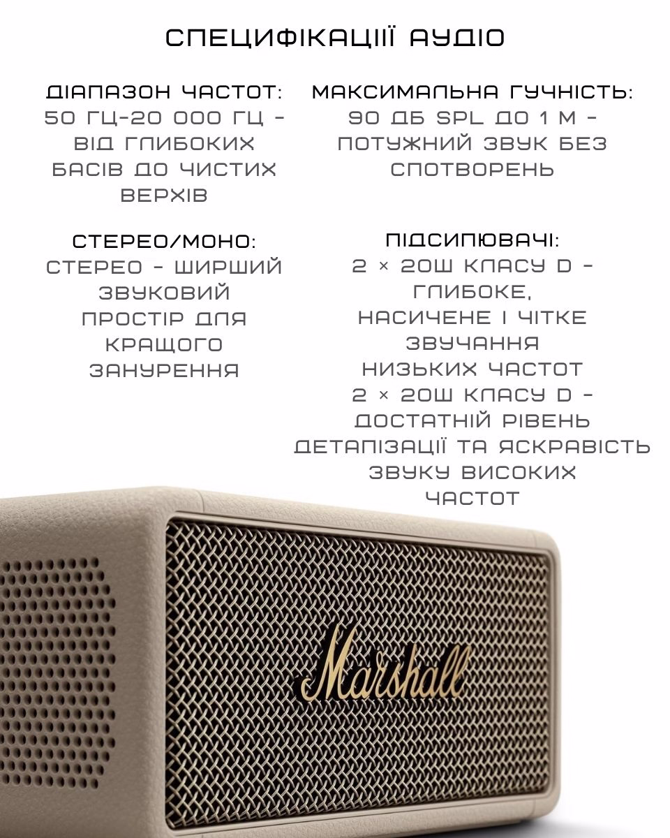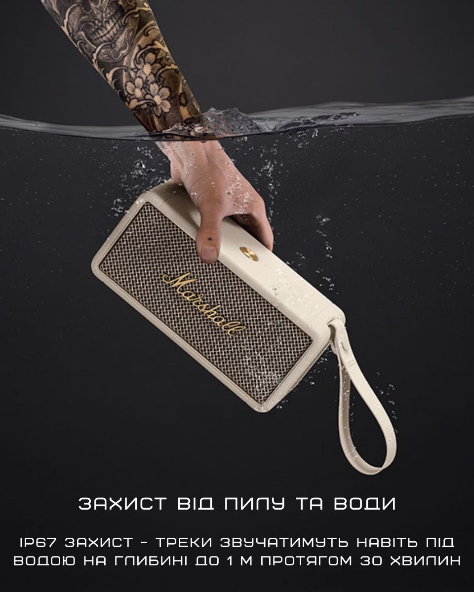 Marshall Middleton почувається як удома і у фестивальному бруді, і на полірованому столику вдома завдяки своєму культовому, але міцному дизайну. А її міцний пило- та водостійкий корпус з рейтингом IP67 подбає про те, щоб ні краплі дощу та бруду не потрапило всередину колонки.