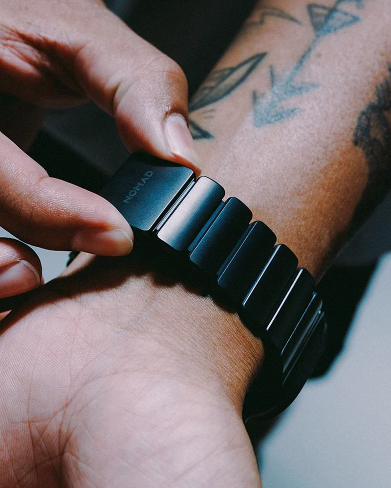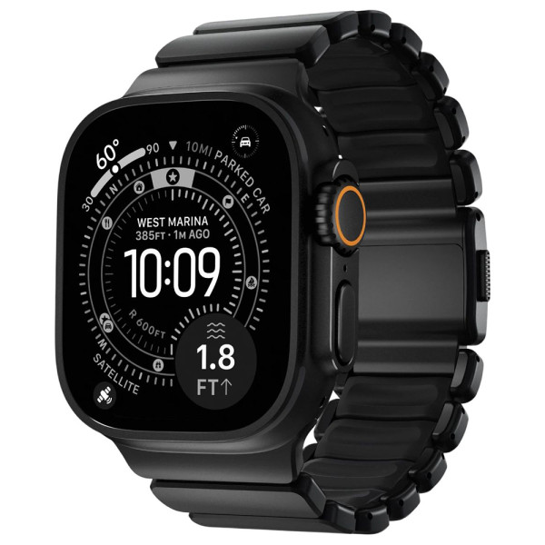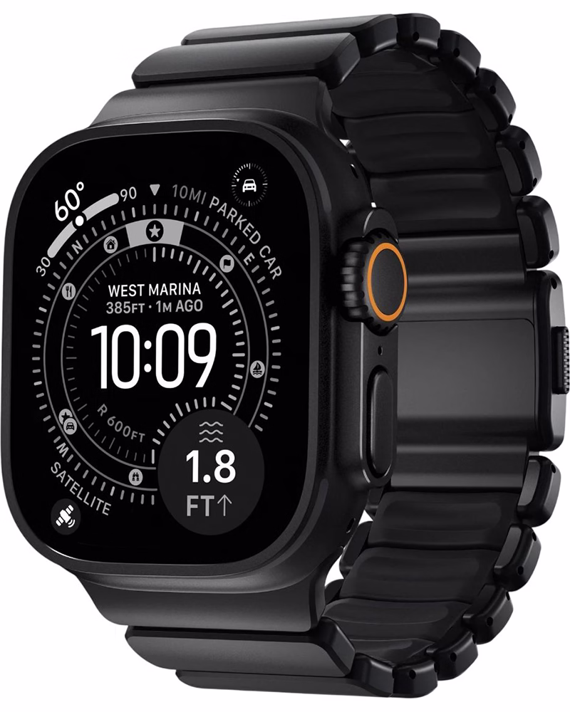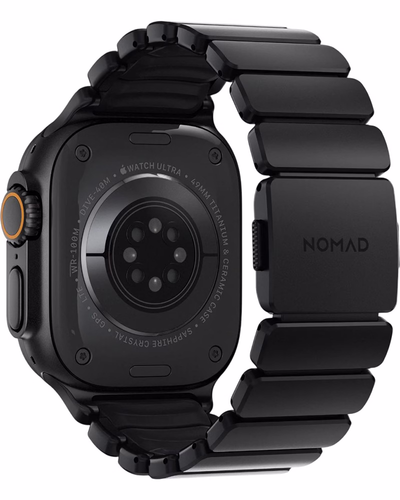 Nomad Stratos Band поєднує міцність титану Grade 4 і гнучкість FKM-ланок для комфортного носіння. Магнітна застібка з N52 забезпечує надійну фіксацію під час активностей. Дизайн водостійкий та пристосований до щоденного використання, у комплекті є інструмент для зміни довжини. Сумісний з Apple Watch Ultra 1–3, а також Series 1–11 і SE.