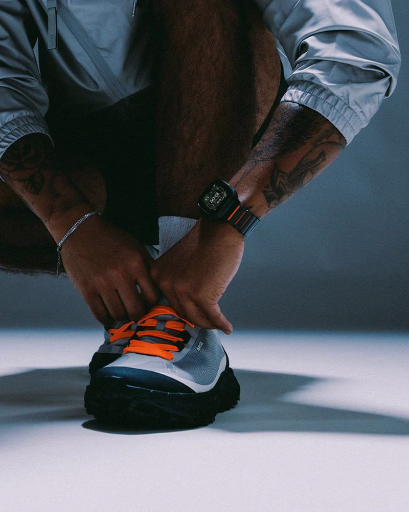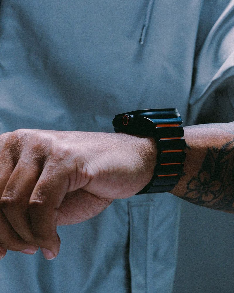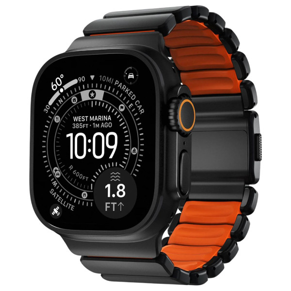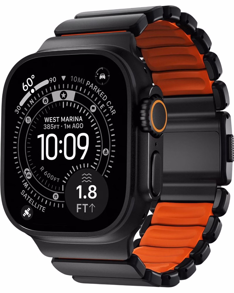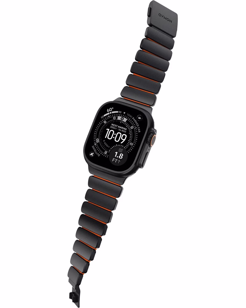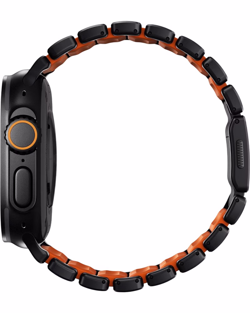 Nomad Stratos Band створений для Apple Watch Ultra й сумісний з Series 1–11 та SE. Титанові ланки формують міцний зовнішній контур, а FKM всередині додає гнучкість і водостійкість. Магнітна застібка N52 тримає ремінець стабільно під час руху. Довжина регулюється інструментом з комплекту.