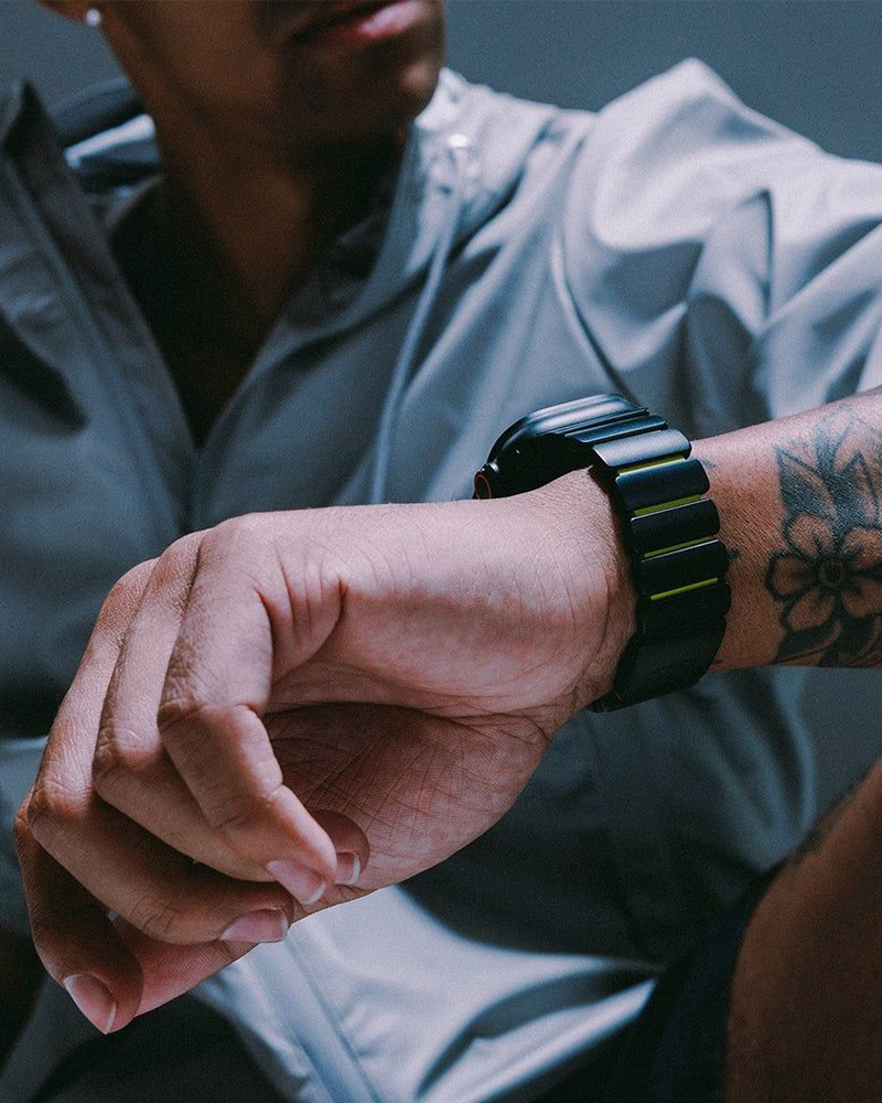 Stratos Band поєднує титанову міцність і гнучкість FKM, щоб ремінець рухався разом із зап’ястям. DLC-покриття допомагає зберігати вигляд фурнітури, а водостійка конструкція підходить для активного дня. Магнітна застібка N52 розрахована на надійне утримання. Підтримуються Apple Watch Ultra 1–3, Series 1–11 та SE.