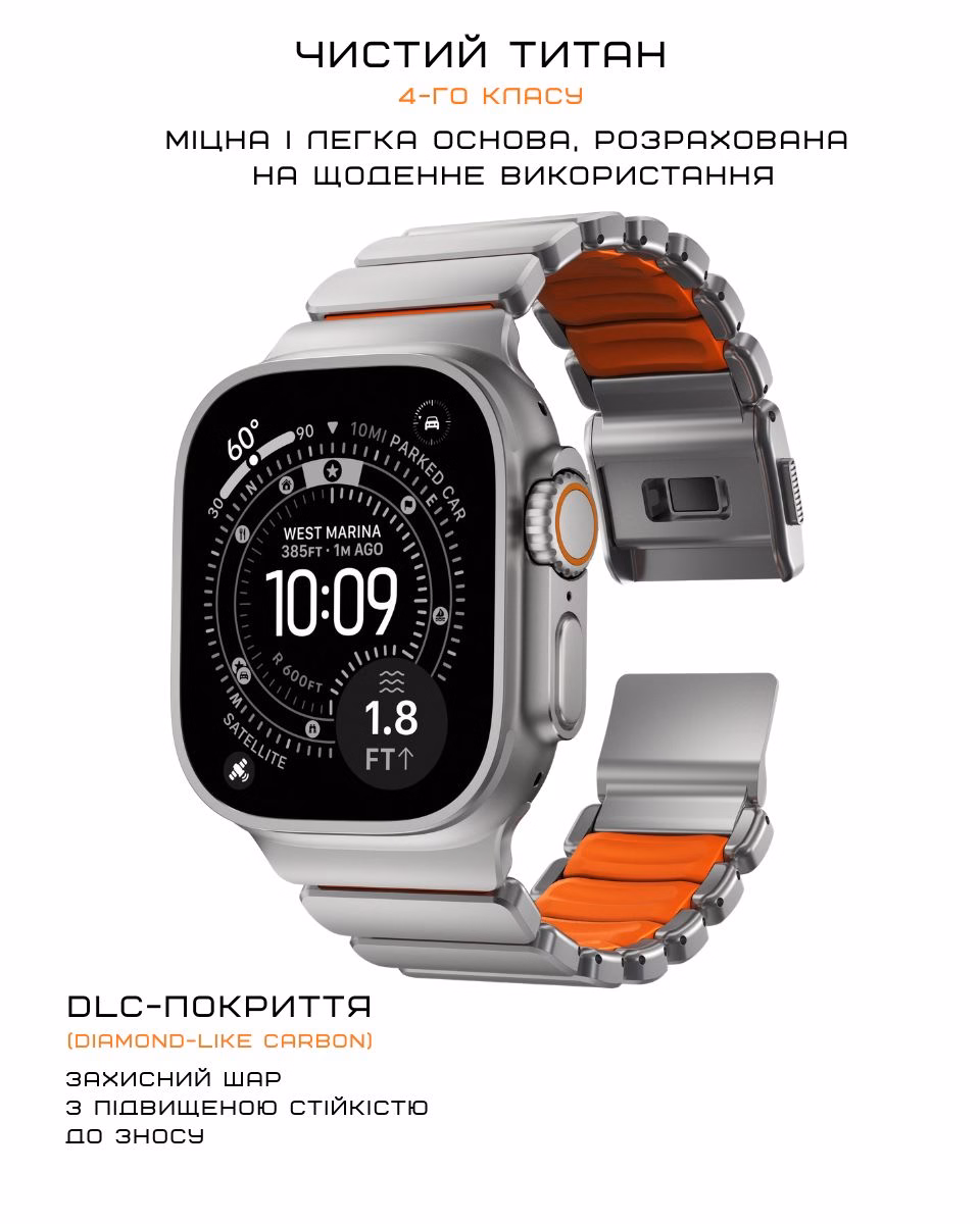 В результаті бренд поєднав два матеріали, які до цього ще не зустрічалися разом і навіть ніхто не міг поєднати: титан і FKM (фтореластомер). Ремінець створений для комфорту протягом усього дня: від ранкової пробіжки до робочих зустрічей, від офісу до активних подорожей.