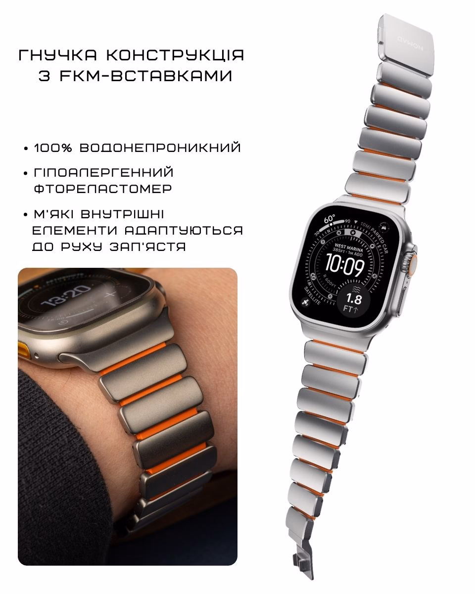 Фтореластомер відповідає за гнучкість і м’якість. Це матеріал, який стабільно поводиться в різних умовах: не боїться вологи, не вбирає піт і зберігає свої властивості з часом. З внутрішньої сторони ремінця передбачені м’які вставки з цього матеріалу. Вони мають М-подібну форму, яка трохи піднімає їх над титановою основою і створює простір між ремінцем і зап’ястям.