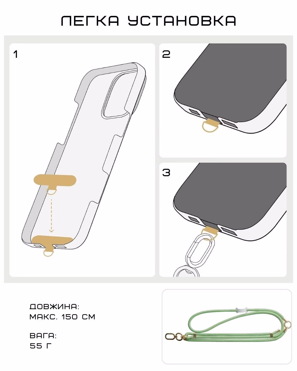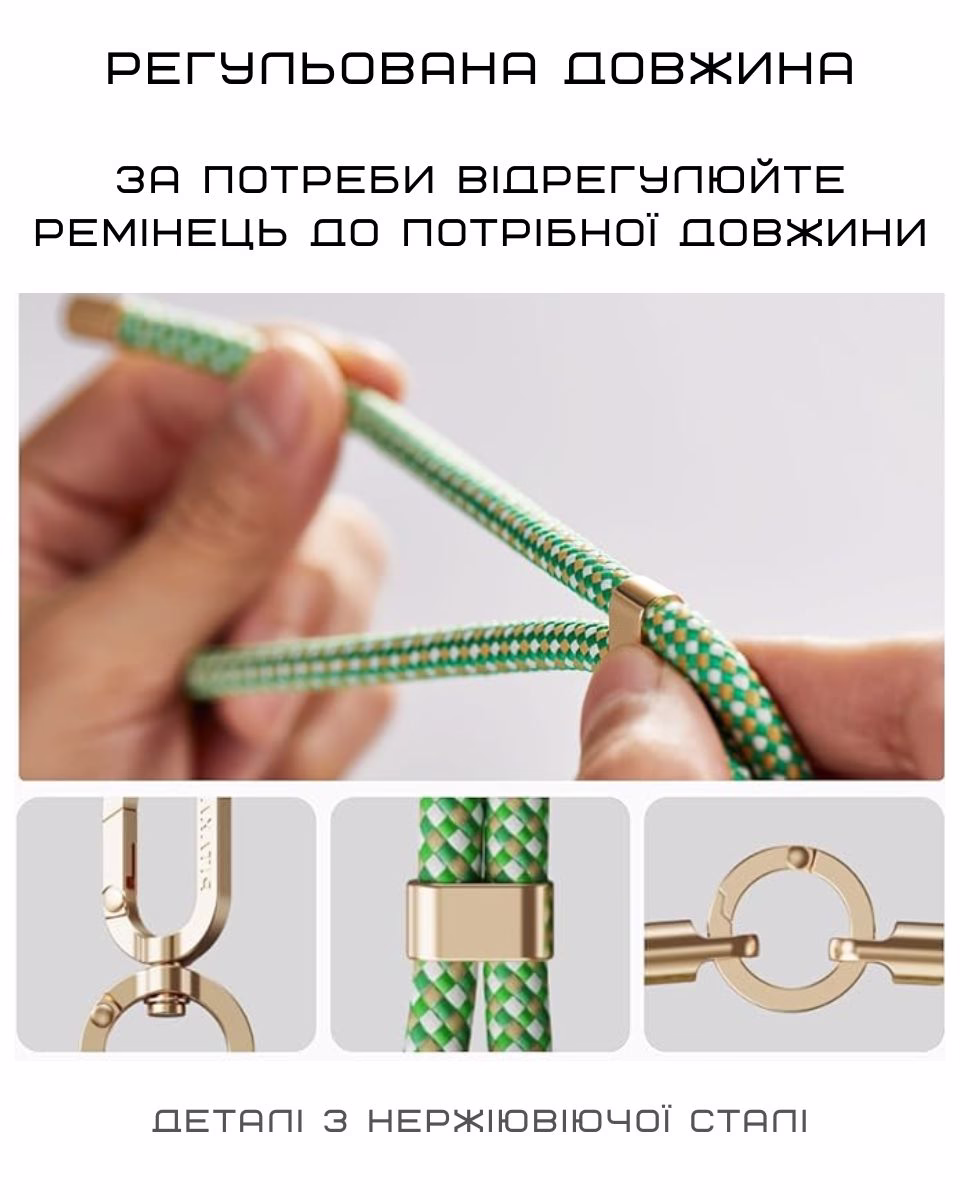 - Ремінець можна носити на шиї, через плече або на зап’ясті.