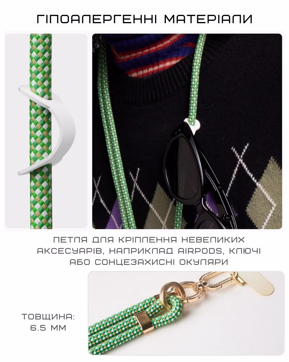 Додатковою зручною особливістю є наявність петлі, призначеної для кріплення невеликих, але важливих аксесуарів, таких як AirPods, ключі або сонцезахисні окуляри. Це дозволяє тримати необхідні речі під рукою, не перевантажуючи кишені чи сумку.