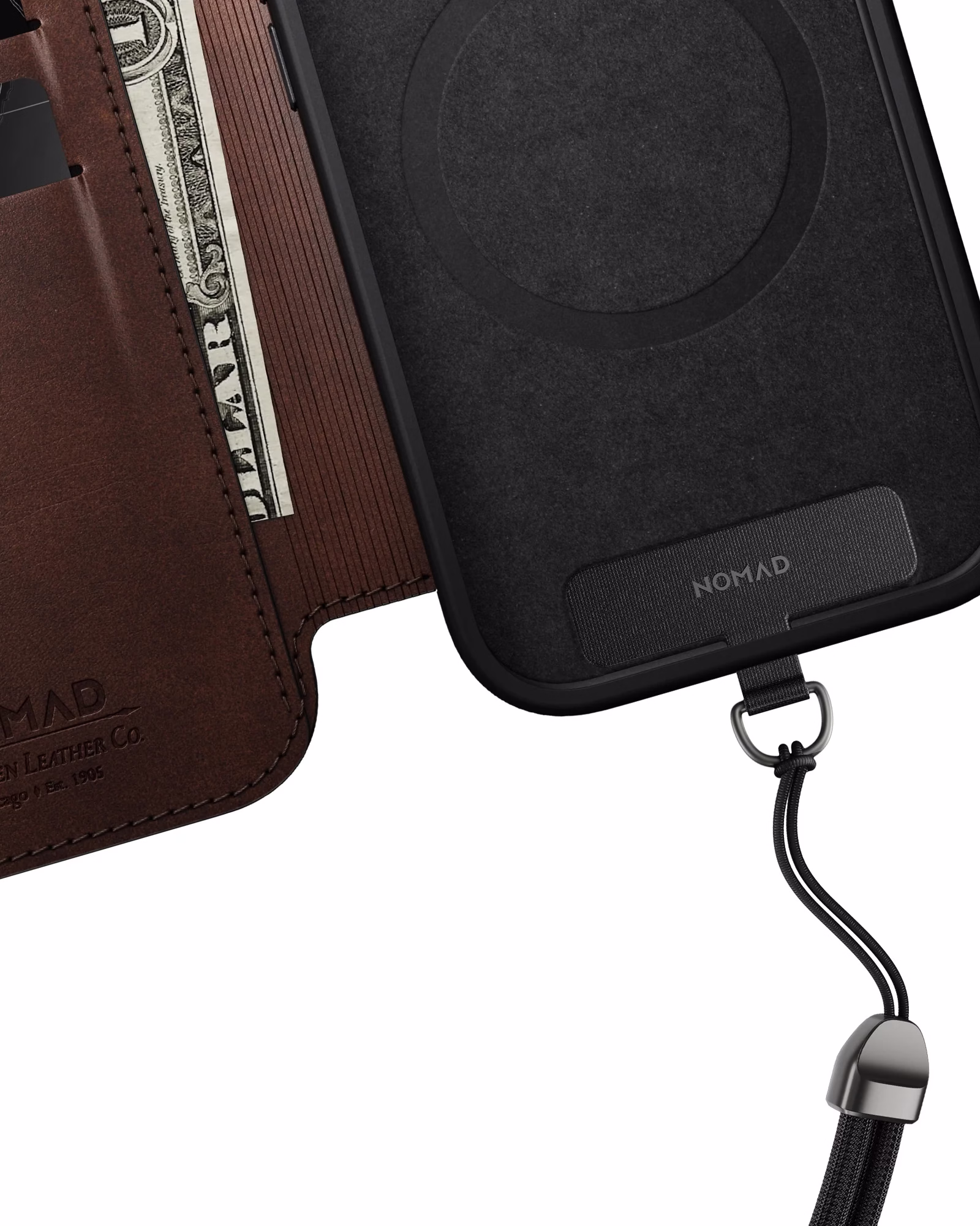 Класичний чохол-книжка від Nomad з натуральної американської шкіри Horween, яка з часом набуває унікальної патини. Забезпечує надійний захист та сумісність з аксесуарами MagSafe.