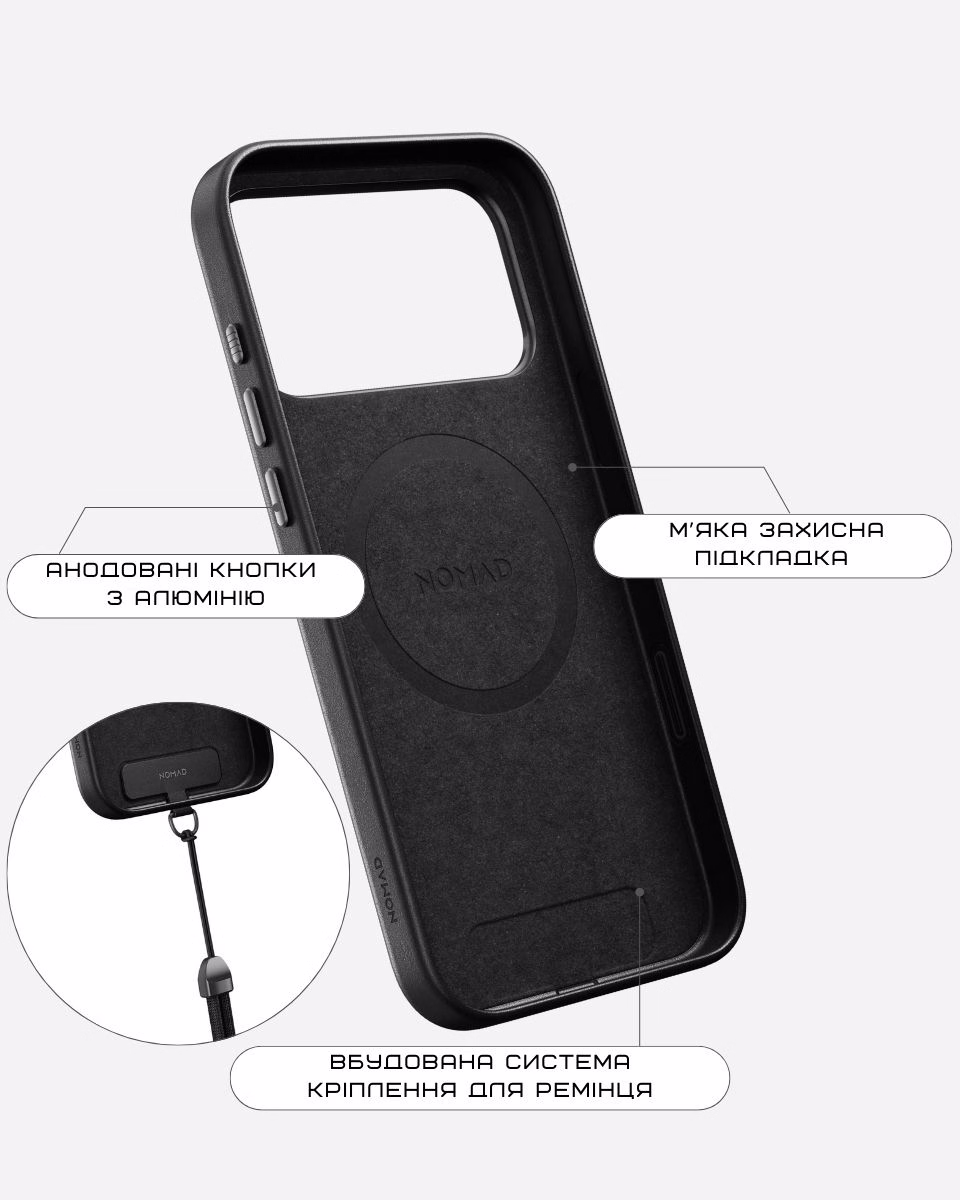 М’яка внутрішня підкладка захищає корпус від дрібних подряпин, а злегка підвищений край допомагає вберегти екран. Чохол щільно прилягає до телефону, з точними вирізами та природним відчуттям у руці — саме тим, заради чого обирають Nomad.