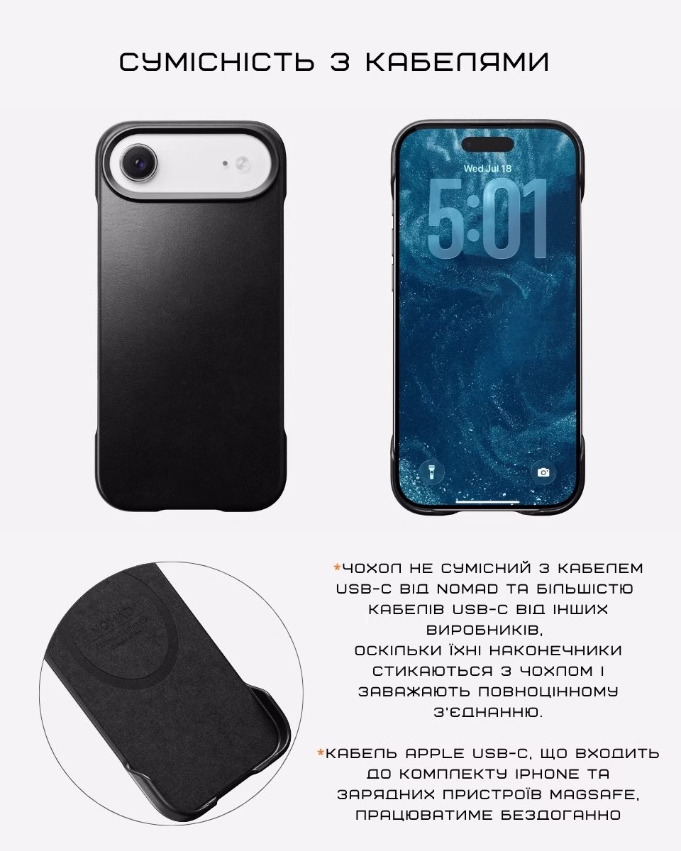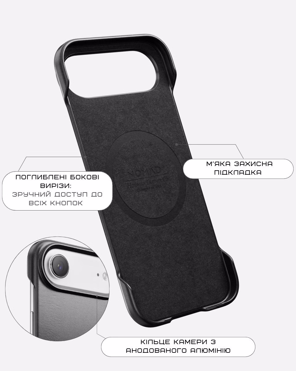 М’яка внутрішня підкладка захищає корпус від дрібних подряпин, а злегка підвищений край допомагає вберегти екран. Чохол щільно прилягає до телефону, з точними вирізами та природним відчуттям у руці — саме тим, заради чого обирають Nomad.