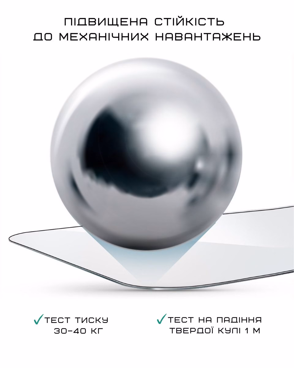 Під час випробування сталевий шар вагою певного стандартного значення вільно падає на плоску поверхню скла, створюючи концентровану точкову силу удару. Важливо, що саме такий тип навантаження є найбільш критичним для ламкого матеріалу, оскільки концентрована сила здатна викликати тріщини навіть у загартованому склі. Тест підтвердив, що скло здатне витримувати повсякденні удари та випадкові механічні впливи.