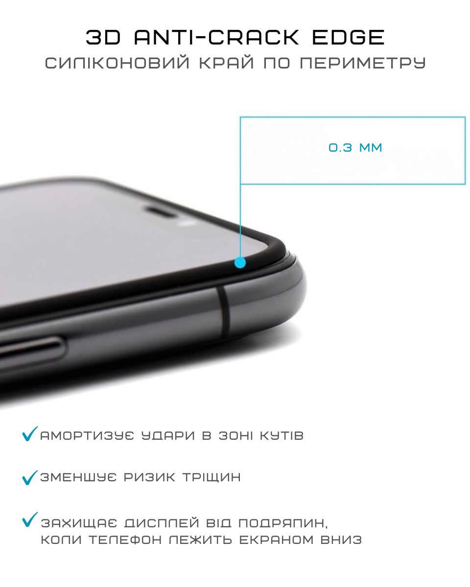 Головна особливість скла Anti-Crack — силіконовий край по всьому периметру. Саме він першим приймає контакт із поверхнею та зменшує навантаження на скло. Адже в реальному житті при падінні телефона удар зазвичай припадає саме на кут або край.