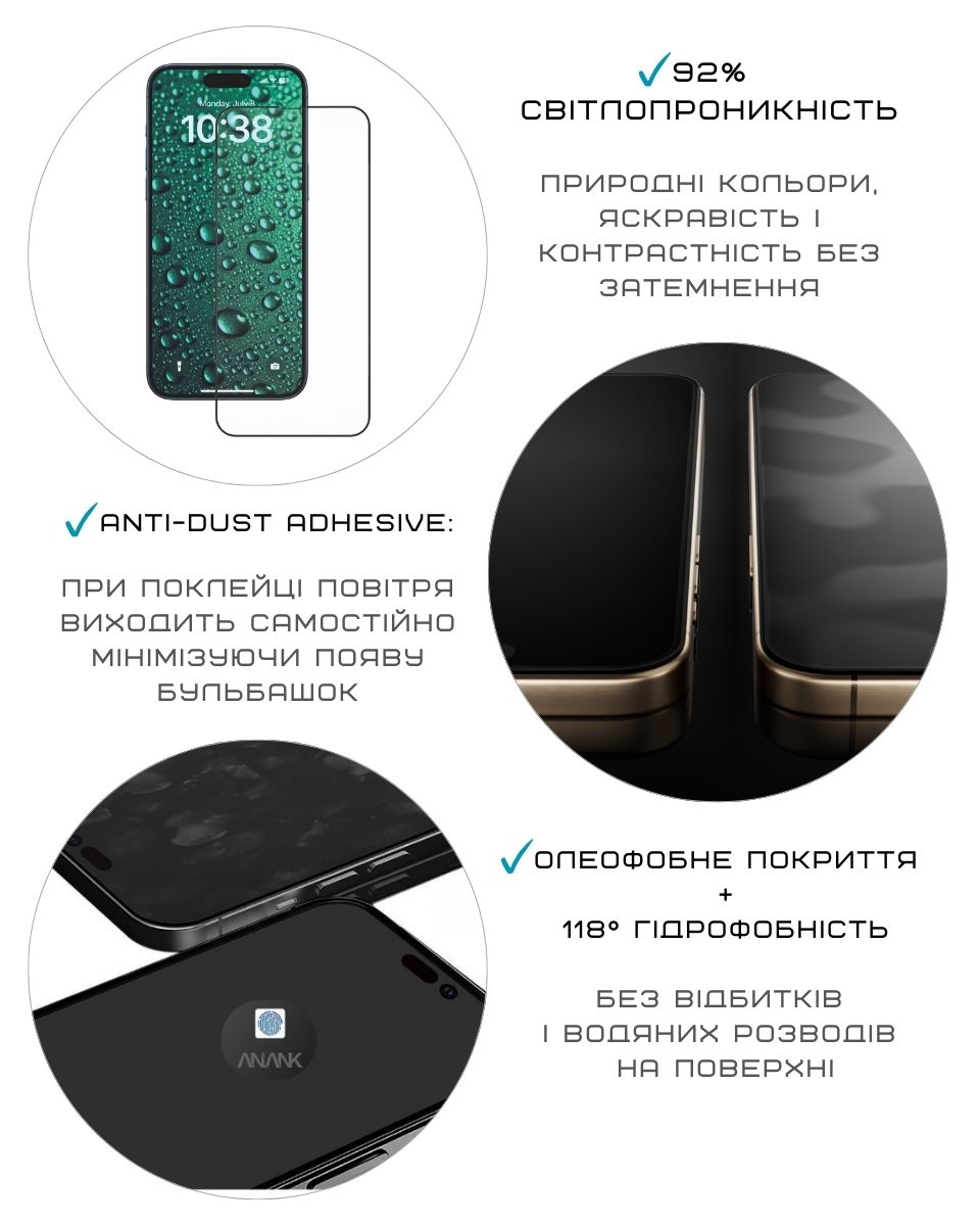 У склі ANANK використовується антипиловий клейовий шар, що зменшує ймовірність потрапляння дрібних частинок під час встановлення.