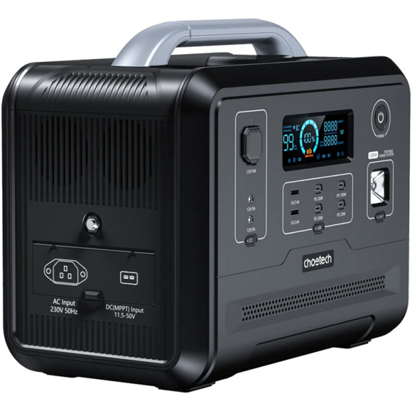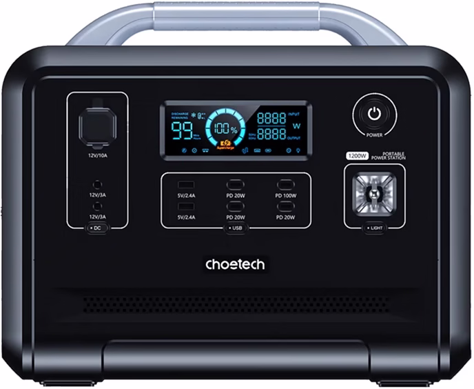 Незалежно від того, піднімаєтеся ви в гору, подорожуєте на автофургоні або розміщуєтеся на відкритому повітрі, електростанція Choetech потужністю 1200 Вт/год зарядить ваші електронні пристрої. Оснащена входом/виходом змінного струму, входом/виходом постійного струму, трьома портами PD потужністю 20 Вт, одним портом PD потужністю 100 Вт, двома портами USB-A 5 В/2.4 А, РК-дисплеєм і трьома режимами освітлення — ця електростанція стане в нагоді на вулиці або під час відключення електроенергії.