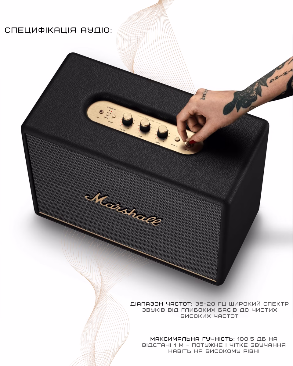 - Запоминающийся дизайн: классический дизайн Marshall с современным звучанием – идеальное сочетание для твоей стильной комнаты. Она не просто играет музыку, она придает изюминку твоему интерьеру.