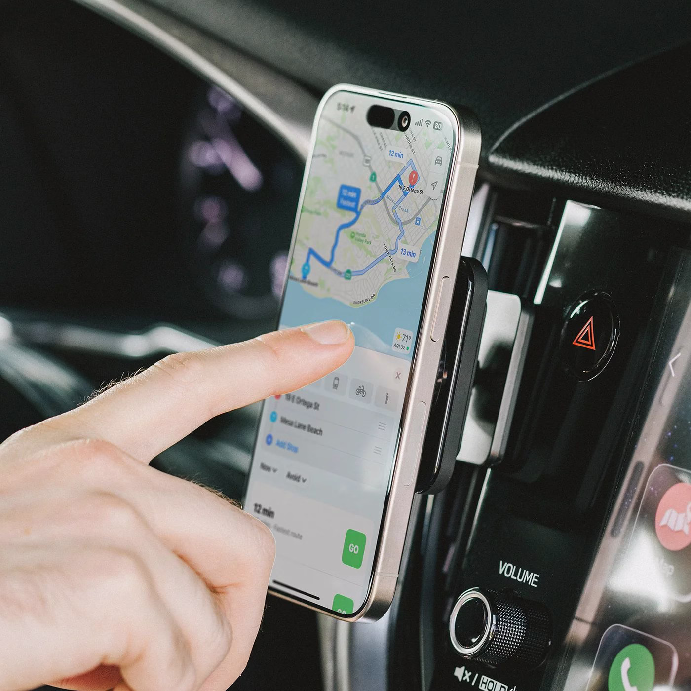 Магнитный автомобильный держатель позаботится об удобстве и безопасности, надежно удерживая телефон, пока ты сосредоточен на управлении автомобилем. Одной рукой меняй положение телефона, благодаря гладкому шарнирному механизму крепления, не отвлекаясь от дороги.
