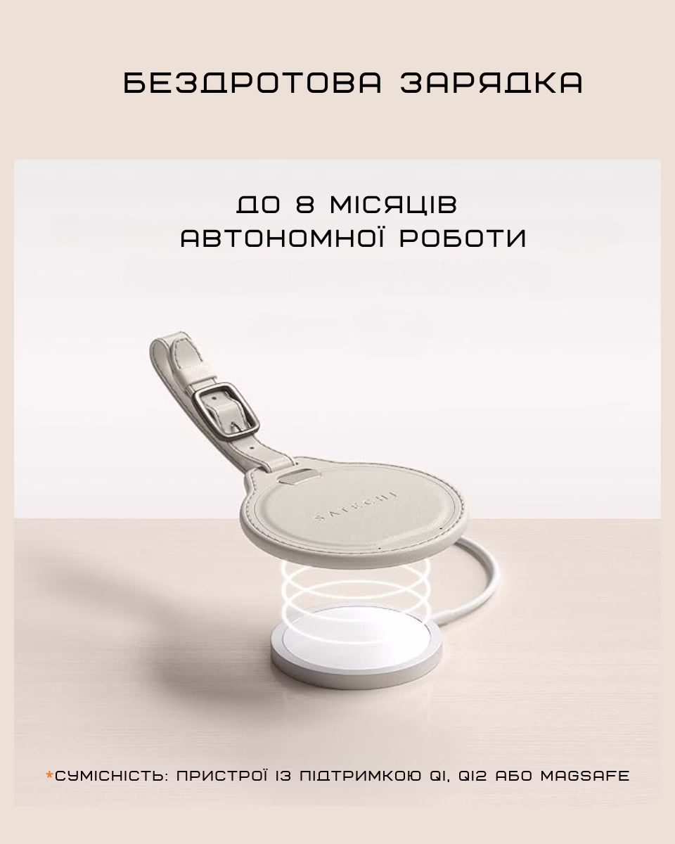Бирка FindAll™ поддерживает удобную беспроводную зарядку. Встроенный литиевый аккумулятор ёмкостью 150 мАч совместим с Qi, Qi2 и MagSafe, поэтому одного заряда хватает до 8 месяцев работы. Аккуратный светодиодный индикатор показывает состояние зарядки: зелёный означает, что трекер готов к использованию, а оранжевый — что он ещё заряжается.