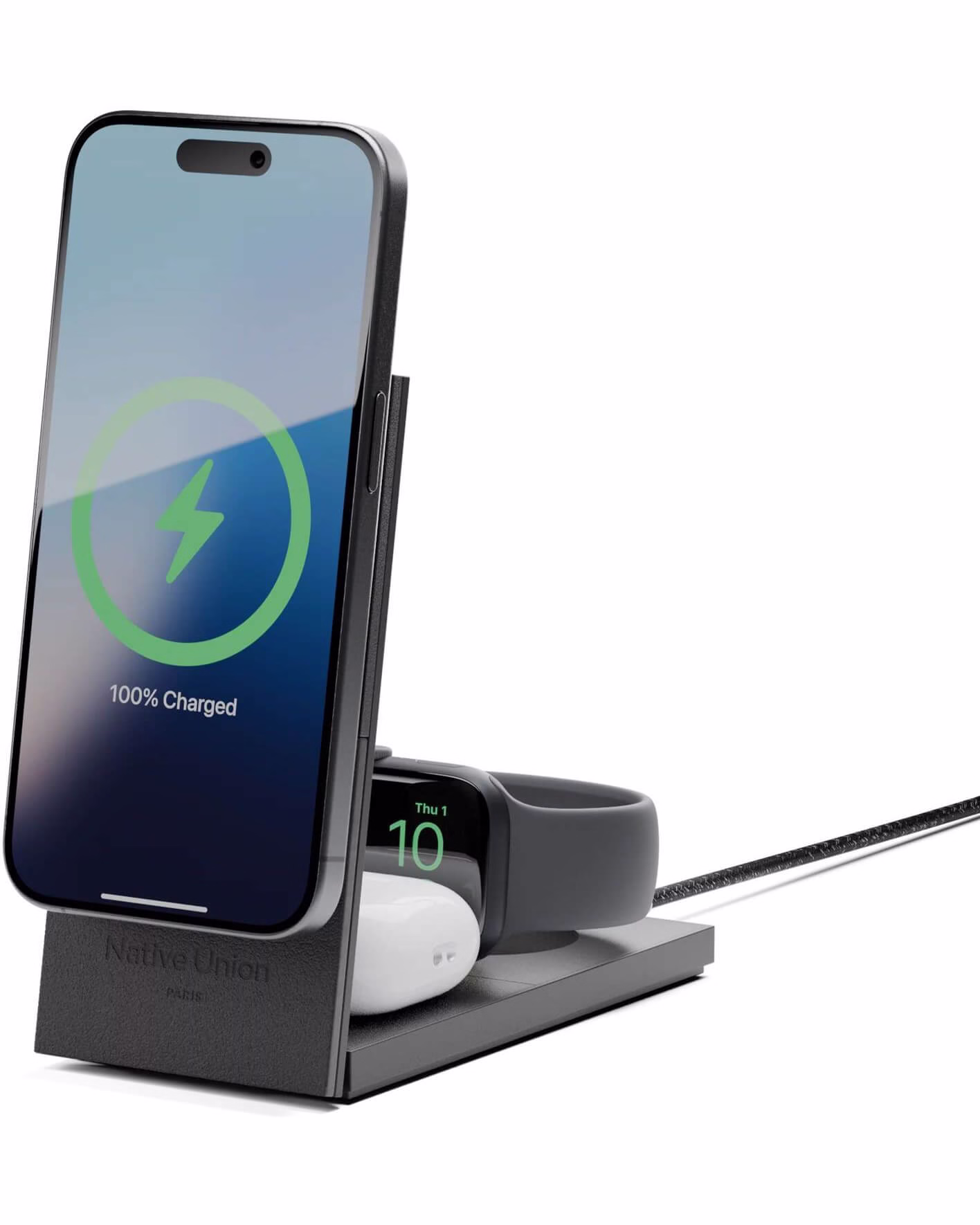 Rise 3-в-1 избавит от лишних кабелей и сделает процесс питания более удобным и экономным в пространстве. Заряжай телефон в вертикальном положении одновременно с AirPods и Apple Watch, или в сложенном варианте под удобным углом.