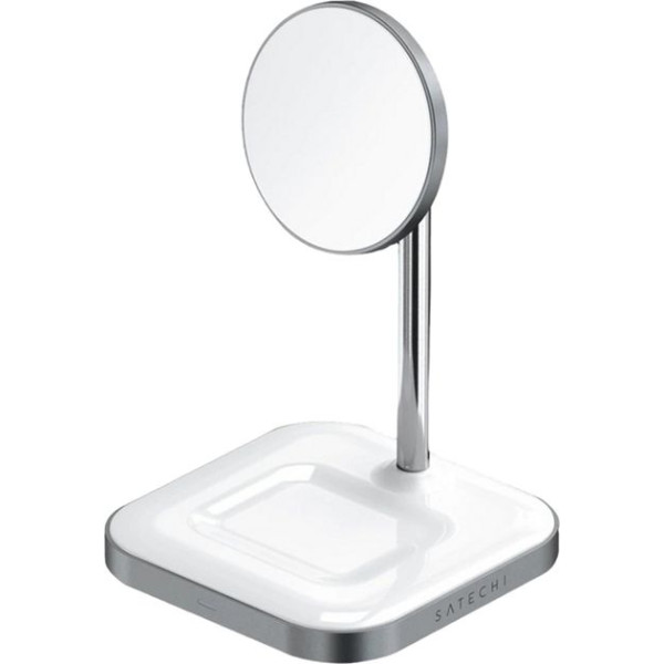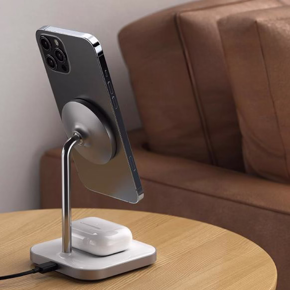 Магнитная подставка для беспроводной зарядки Satechi 2-в-1 сочетает в себе мощность двойной зарядки и удобство магнитного крепления без использования рук. Подставка, разработанная для iPhone и AirPods Pro, оснащена встроенным зарядным магнитным устройством и специальной беспроводной зарядной панелью для легкого питания обоих устройств.