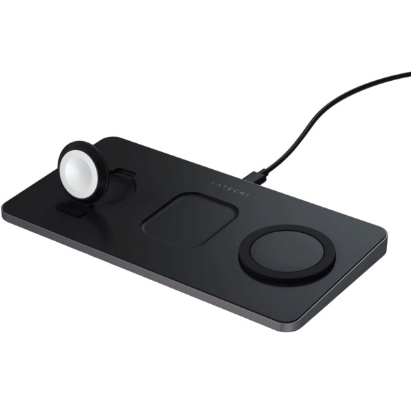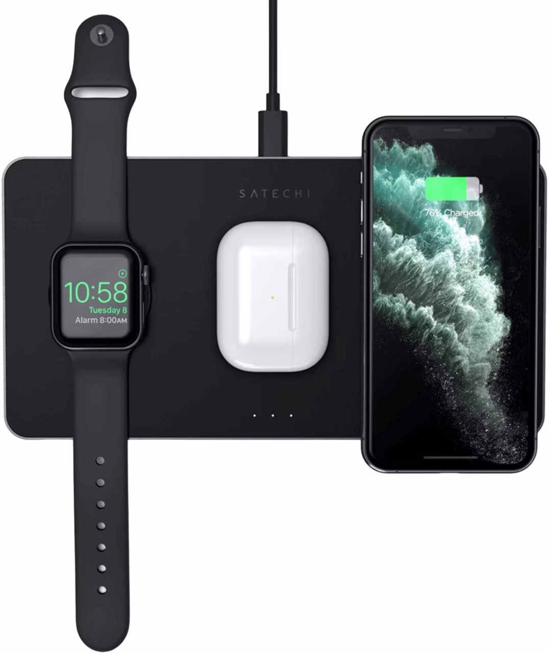 Одновременно заряжайте до трех устройств – серии Apple Watch (до 2,5 Вт), AirPods с футляром для беспроводной зарядки (до 5 Вт) и iPhone с поддержкой стандарта Qi (до 7,5 Вт) или смартфона – все от одного утонченного, современного станция.