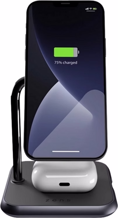 Беспроводное магнитное зарядное устройство 3-в-1 имеет достаточную мощность, чтобы заряжать 3 устройства одновременно. Магнитный держатель заряжает iPhone в альбомном или портретном режиме. Основой зарядного устройства является зона беспроводной зарядки, на которой можно заряжать AirPods (беспроводно заряжаемые) или любое другое устройство Qi. Правая сторона основания имеет встроенный порт USB-C Power Delivery мощностью 27 Вт. Через этот порт можно легко зарядить свой iPad или даже MacBook Air. Обратите внимание, что адаптер питания не включен. Чтобы одновременно заряжать iPhone, AirPods, iPad или MacBook Air, рекомендуем адаптер USB-C 60 Вт PD. Если вы хотите только заряжать свой iPhone и AirPods, достаточно зарядного устройства USB-C 18 Вт.