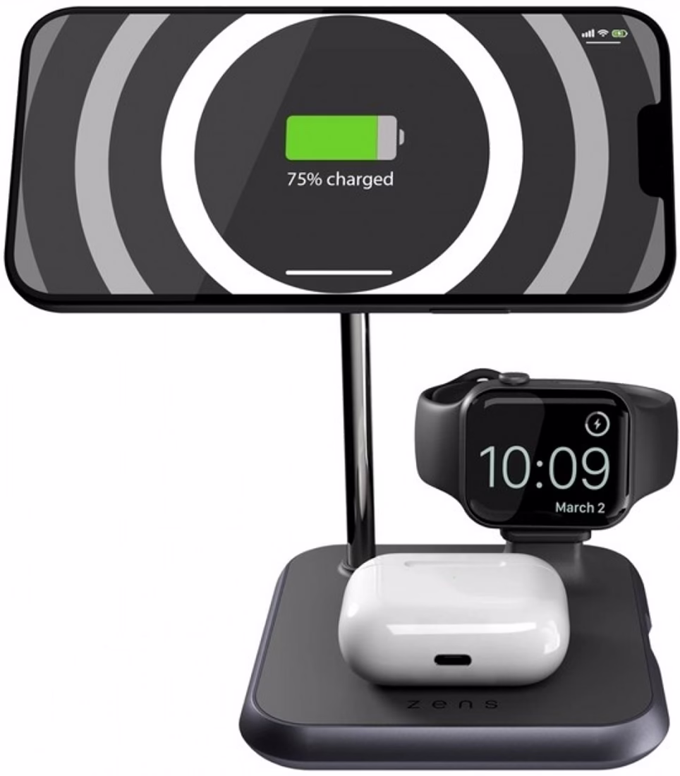 - Заряжает совместимые с MagSafe iPhone, Apple Watch и AirPods одновременно.
