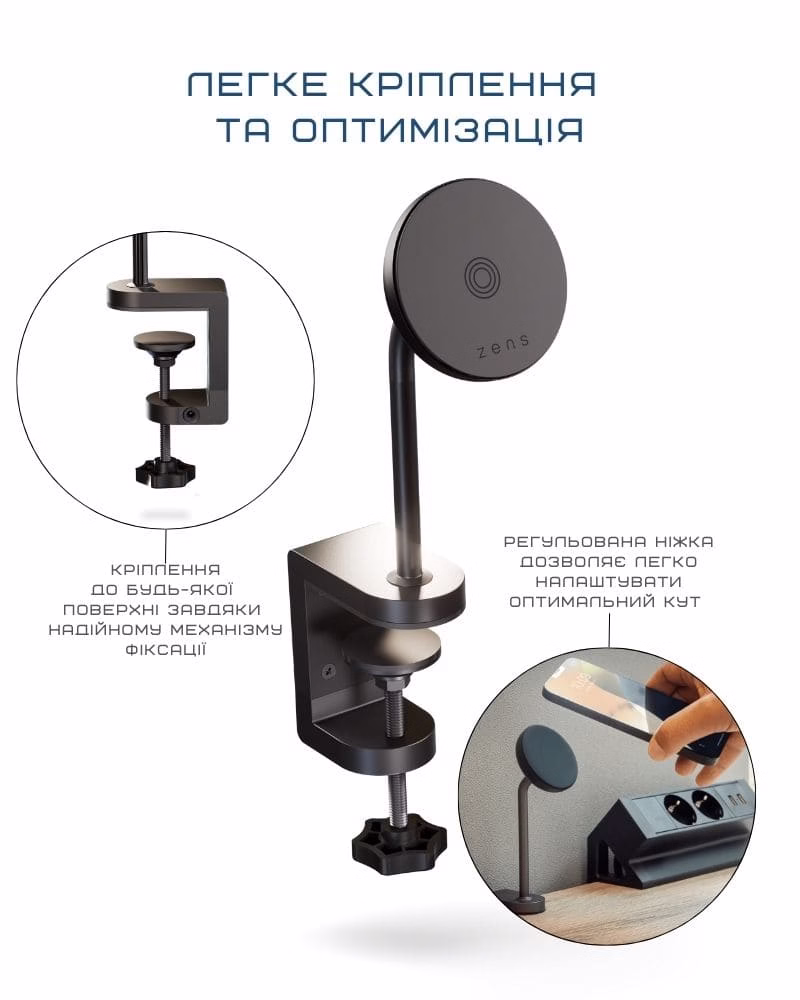 Беспроводная зарядка Zens Office Charger Mount Pro - твой личный энергетический центр, который можно разместить там, где удобно. Офис, коворкинг, кухня, спальня или любой другой уголок помещения - крепкий зажим обеспечивает стабильность и безопасность твоего телефона.