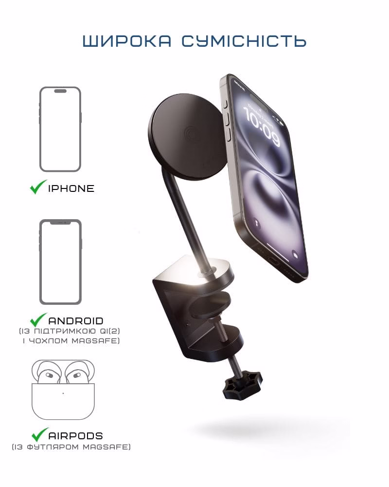 Это зарядное устройство поддерживает стандарт Qi, поэтому совместимо со всеми смартфонами с беспроводной зарядкой, включая iPhone (MagSafe), Samsung, Pixel, а также наушники с Qi-чехлом. Мощность — до 15 Вт.2. Как она крепится к поверхности?