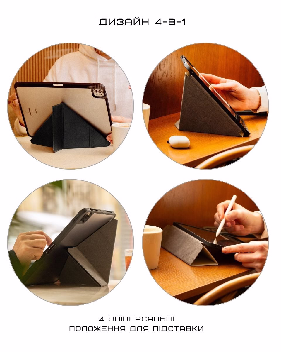 Чехол Active Case создан для тех, кто ценит комфорт и продуктивность. Передняя панель легко трансформируется в подставку, предлагая четыре варианта положения в зависимости от задачи. Просмотр видео, рисование, набор текста или видеозвонки — для каждого режима предусмотрен оптимальный угол наклона для максимального удобства.