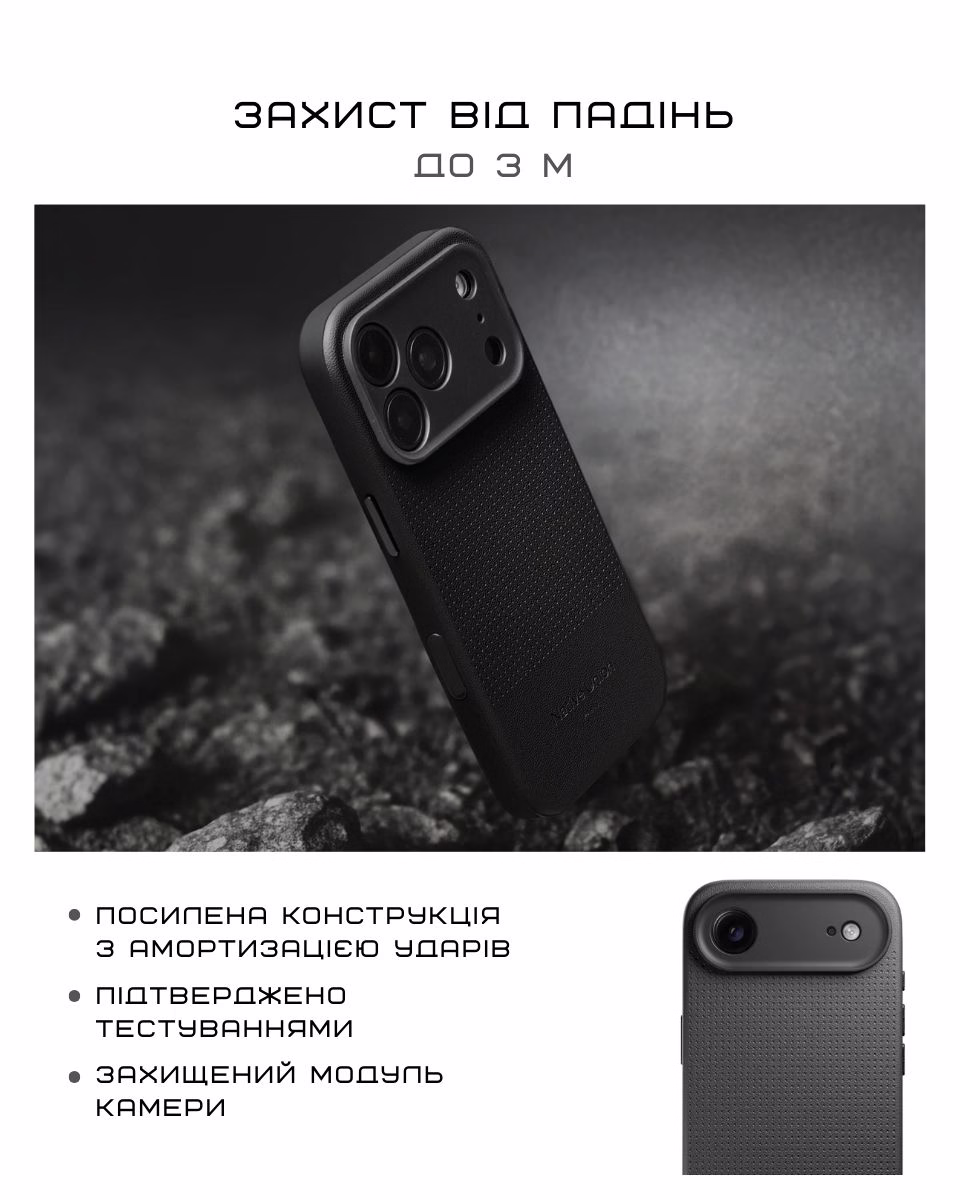 Лаконичный дизайн сочетается с серьезной защитой от падений до 3 м. Поверхность с мелкой перфорацией мягкая и приятная на ощупь, а сам чехол удобно лежит в руке и бережно окутывает телефон со всех сторон. Модуль камеры аккуратно обрамлен и визуально отделен от корпуса, чтобы помочь защитить линзы в ежедневном использовании.