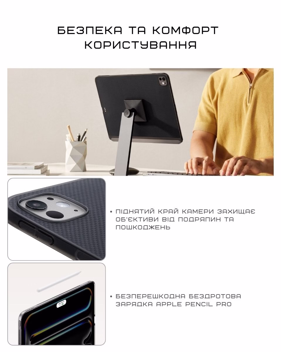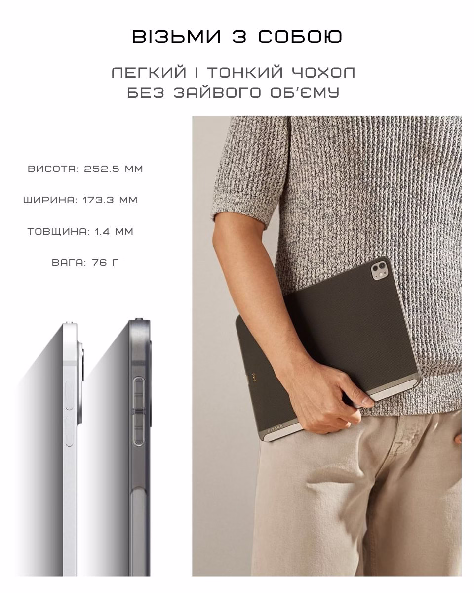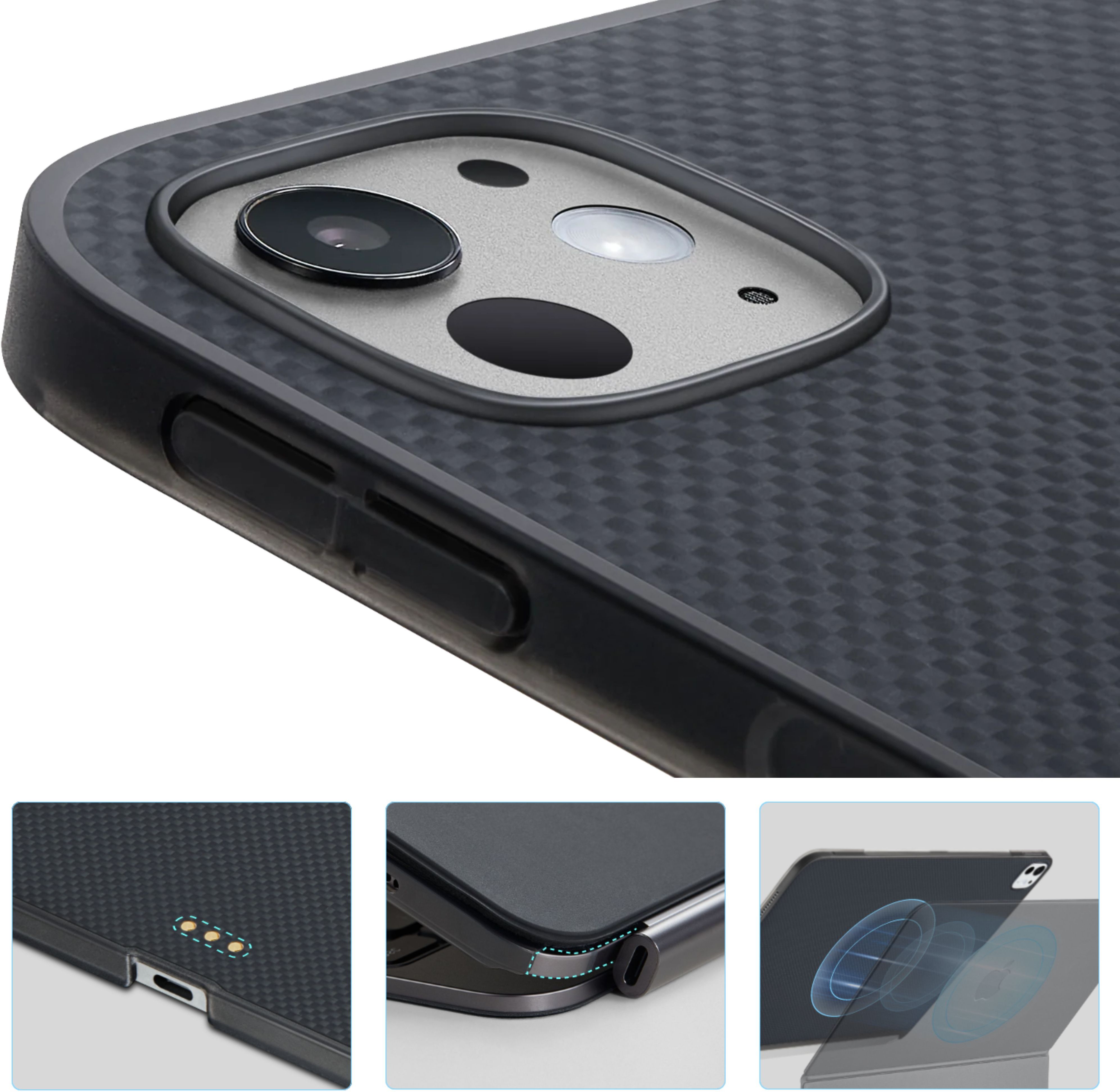 Тонкий защитный чехол, который охватывает iPad с трёх ключевых сторон — надёжно удерживает заднюю панель и края, чтобы планшет оставался целым и невредимым. Плотно прилегает, точно повторяя форму. Не утяжеляет, не скользит, не мешает работе. Все кнопки, порты и магниты — открыты и доступны. Совместим с Apple Magic Keyboard и поддерживает бесперебойную зарядку Apple Pencil Pro. Pitaka создали практичное решение для всех пользователей iPad, учтя потребности в надёжной защите и удобной функциональности планшета.