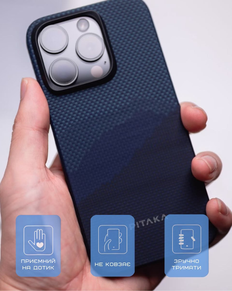Прочный чехол из арамидного волокна защищает смартфон от случайных падений, царапин и ударов. Стильный, невесомый и надёжный аксессуар премиального уровня, который не захочется выпускать из рук.