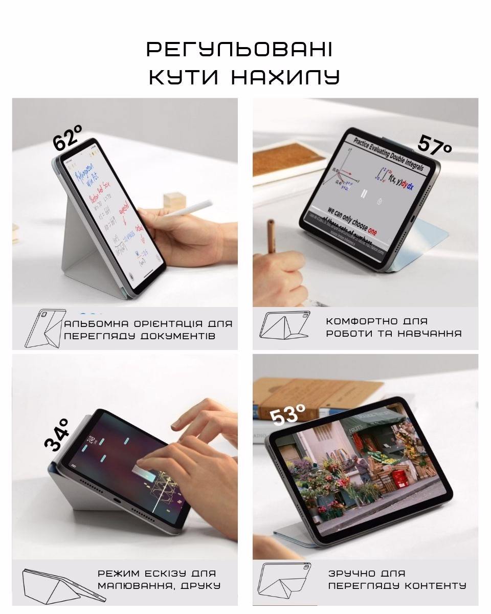 Да. Есть два фиксированных угла наклона — рабочий и для просмотра. Магниты держат стабильно: iPad не “сползает”, даже если печатать. Это не универсальный чехол — это тот, который работает именно так, как нужно.5. Особенности использования: