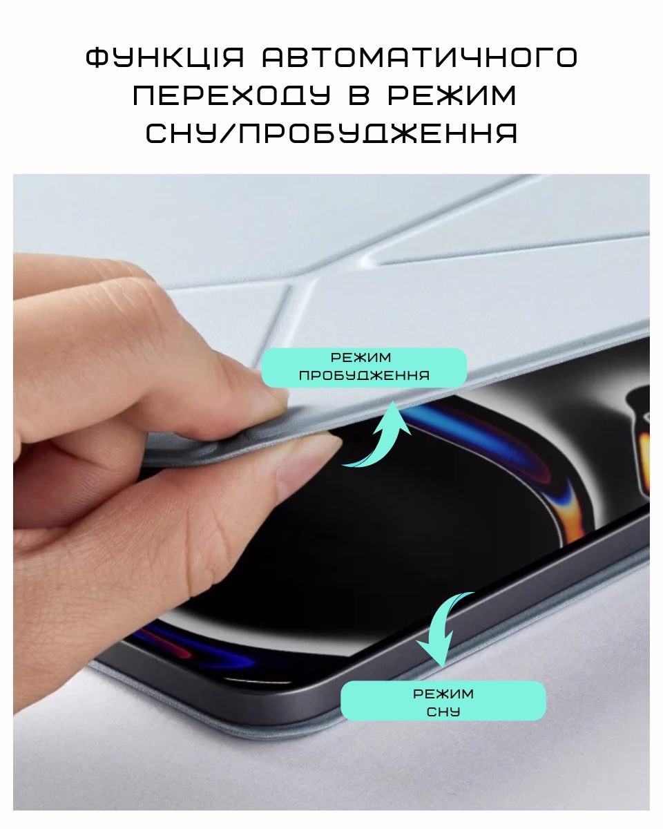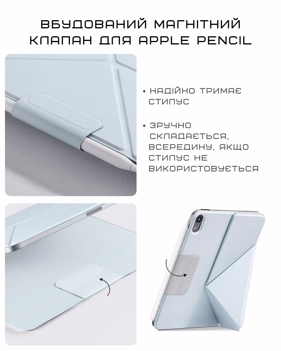 Устанавливается одним движением — и так же легко снимается. Поддерживает функцию автоматического сна и пробуждения, что экономит заряд батареи и избавляет от лишних движений. Встроенный магнитный клапан для Apple Pencil: если ты не используешь стилус, клапан можно просто спрятать.