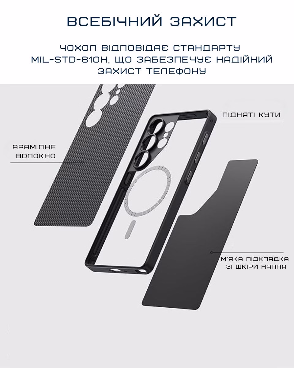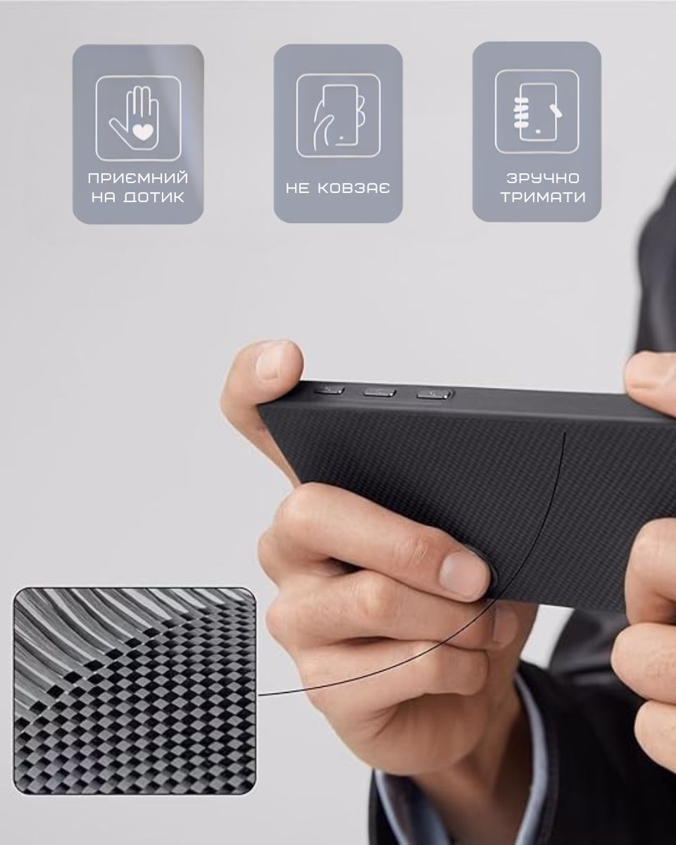 Сверхпрочный чехол из арамидного волокна защищает телефон от неожиданных падений, царапин и ударов. Стильный, невесомый и надежный аксессуар премиального качества, который не захочется выпускать из рук.