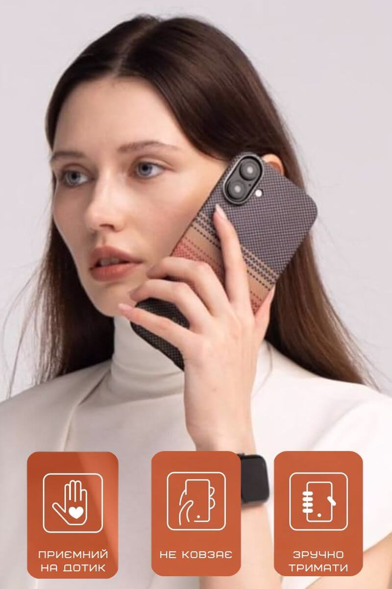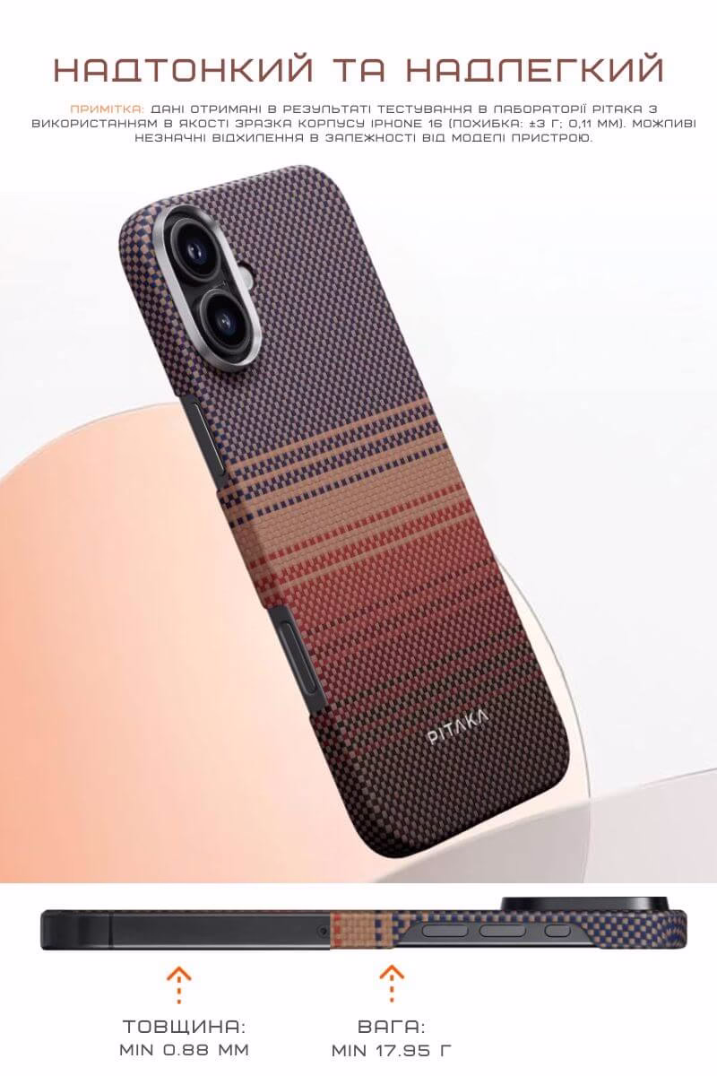Нет, совсем нет! Чехол Pitaka Tactile Woven Case Sunset имеет толщину всего 0,95 мм и изготовлен из лёгкого арамидного волокна. Он практически не прибавляет веса вашему iPhone 16, сохраняя его элегантный вид и удобство в использовании.
