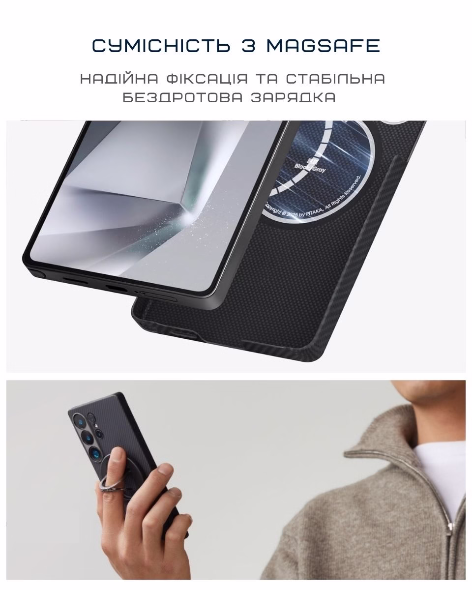Магнитное кольцо бесшовно интегрировано в чехол, сохраняет свою мощность и четкость, при этом чехол остается невероятно тонким и легким.