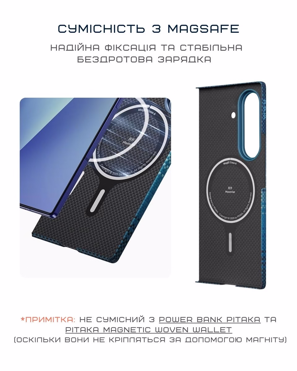 *Обратите внимание: чехол не совместим с магнитным портативным PowerBank Pitaka и с Pitaka Magnetic Woven Wallet (поскольку они не крепятся с помощью магнита).