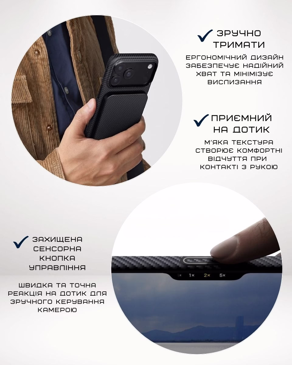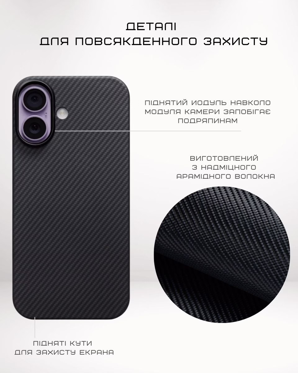 Сверхпрочный чехол из арамидного волокна защищает телефон от неожиданных падений, царапин и ударов. Стильный, невесомый, приятный на ощупь и надежный аксессуар, который не захочется выпускать из рук.
