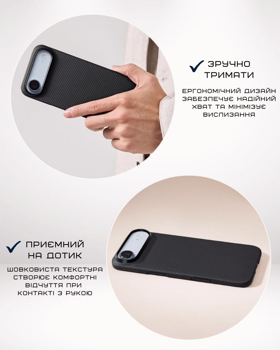 - Арамидное волокно: лёгкий, но прочный материал с приятной тактильной текстурой для ежедневного использования iPhone.