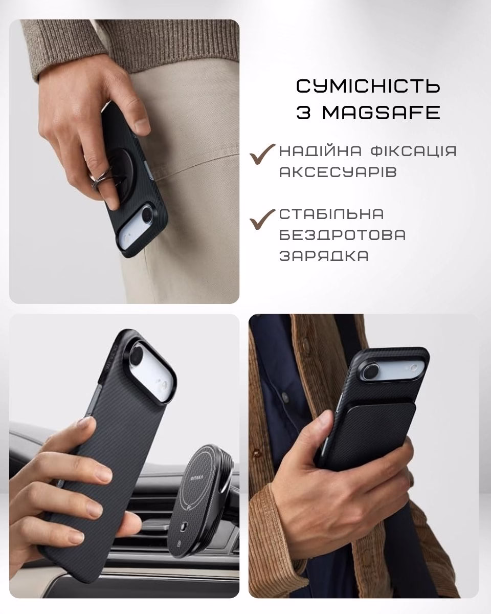 Магнитное кольцо бесшовно встроено в чехол, сохраняя силу и точность фиксации, при этом сам чехол остаётся невероятно тонким и лёгким.