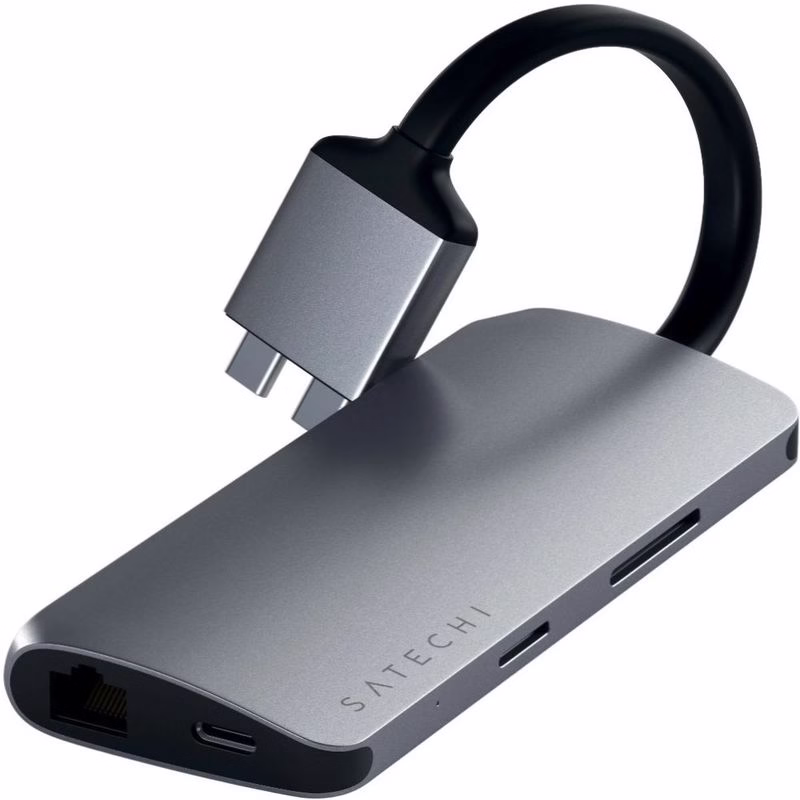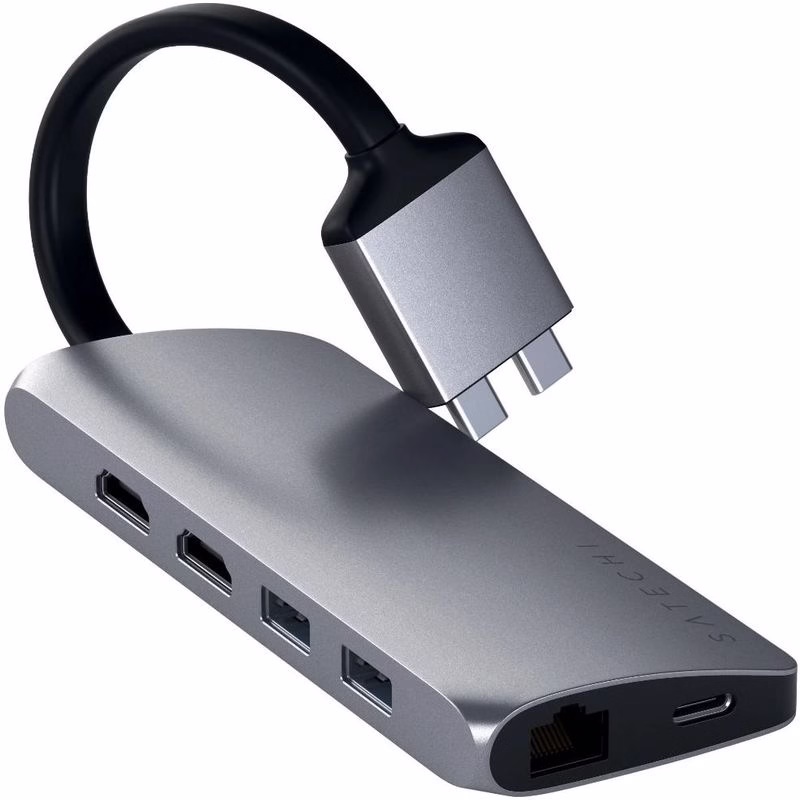 Разработанный как самый мощный адаптер на сегодняшний день, двойной мультимедийный адаптер Satechi Type-C является вашим универсальным решением для подключения всех ваших периферийных устройств. Дизайн Запатентованная конструкция с дизайном и двумя разъемами, позволяющая легко расширить два порта USB-C вашего компьютера для создания мощного и бесперебойного рабочего пространства. Двойной дисплей 4K HDMI Наслаждайтесь великолепным дисплеем 4K HDMI на двух мониторах для потрясающей двойной настройки. Включает один порт 4K 60 Гц и один порт 4K 30 Гц. Двойной мультимедийный адаптер имеет порт для каждого периферийного устройства с двумя портами HDMI 4K, зарядкой PD-USB-C, гигабитным Ethernet, считывателями карт micro / SD и портами USB 3.0.