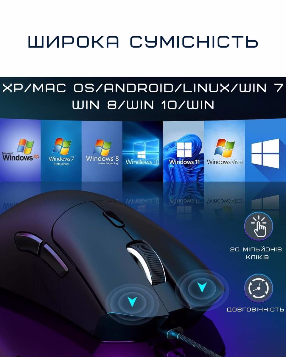 Быстрые, чёткие, тактильные. Никаких случайных нажатий или задержек — только мгновенная реакция. У этой мыши 6 программируемых кнопок, которые позволяют настроить макросы и функции под любую игру или стратегию. Переключатели рассчитаны на 20 млн кликов, так что выдержат даже самые жаркие геймерские баталии. Каждый клик — это точный выстрел, а каждая кнопка выполняет свою роль.
